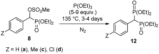 Earlier, we found that the diethyl α-mesyloxy-benzylphosphonates (8) may be efficient reagents in Michaelis–Arbuzov reaction with triethyl phosphite applied in an excess at 135 °C [17]. The corresponding bisphosphonates (12) were isolated in good (76–81%) yields after purification by chromatography (Scheme 8). Bisphosphonate 12a is a known compound that was identified by its δP shift and MS, while products 12c and 12d were described first by us, and, therefore, were characterized by the routine spectral methods [17].