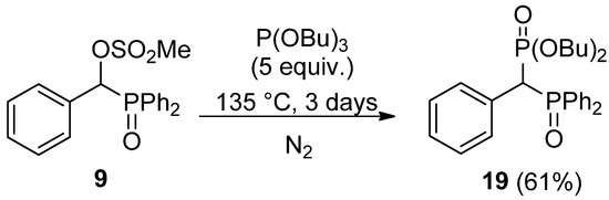 Finally, mesyloxyphosphine oxide 9 was subjected to the Michaelis–Arbuzov reaction with tributyl phosphite under the conditions applied above (Scheme 9). After purification by chromatography, dibutyl phosphonate–diphenylphosphine oxide 19 was obtained in a yield of 61% as white crystals, and was fully characterized as above.