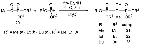Based on our previous experiments, α-oxoethylphosphonates (20) were reacted with dialkyl phosphites in the presence of 5% diethylamine at 0 °C in diethyl ether for 8 h (Scheme 10). After purification by chromatography, symmetric hydroxy-methylenebisphosphonates (2123) were obtained in yields of 68–86% [14].