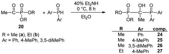 We also investigated the Pudovik reaction of dimethyl and diethyl α-oxoethylphosphonates (20a and 20b) with secondary phosphine oxides, such as diphenylphosphine oxide, bis(4-methylphenyl)phosphine oxide and bis(3,5-dimethylphenyl)phosphine oxide. In these cases, the reactions were carried out at 0 °C for 8 h using 40% of diethylamine as the catalyst (Scheme 11). Products 2427 crystallized out from the mixture, and they were purified by recrystallization to give asymmetric phosphonate–phosphine oxide derivatives (2427) in yields of 62–78% [14].