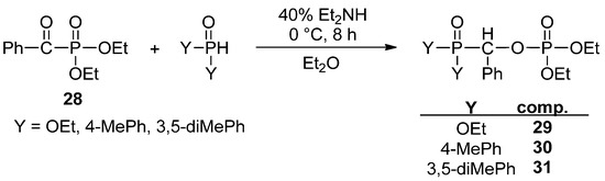 Finally, diethyl α-oxobenzylphosphonate (28) was reacted with diethyl phosphite, bis(4-methylphenyl)phosphine oxide and bis(3,5-dimethylphenyl)phosphine oxide in the presence of 40% diethylamine at 0 °C for 8 h (Scheme 12). The rearranged products (2931) were obtained in yields of 65–74% after purification by chromatography [14].