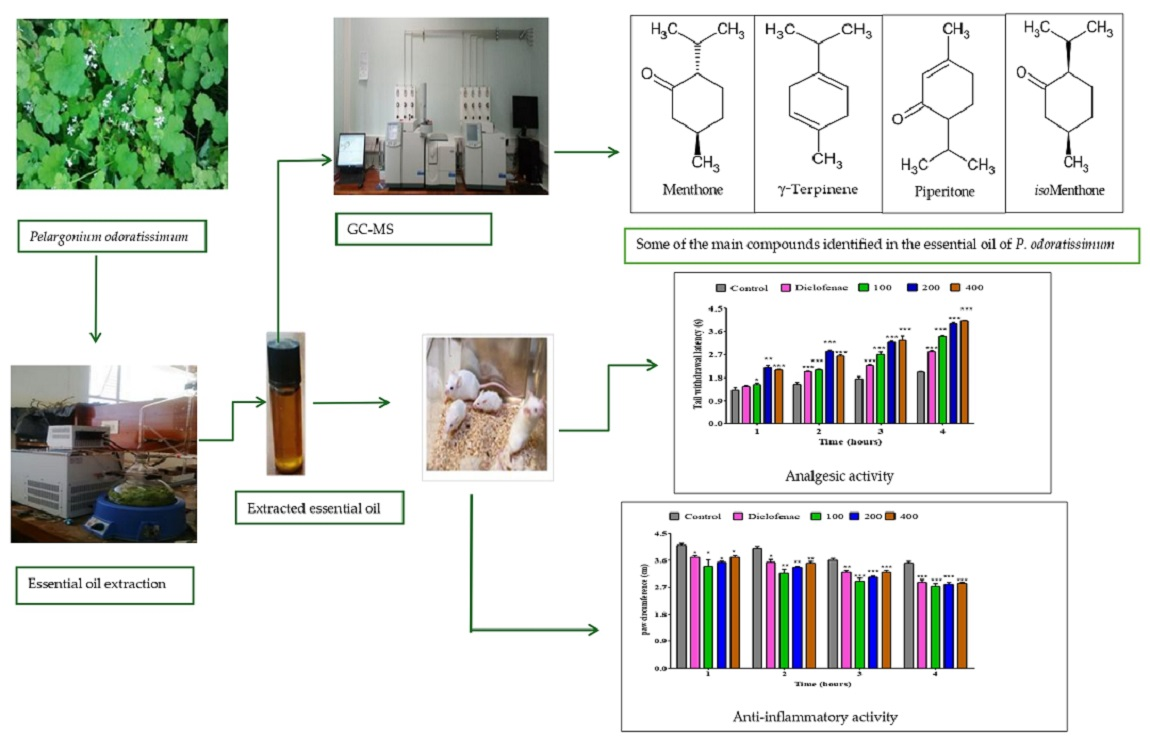 Rungqu, P.; Oyedeji, O. Chemical Composition, Analgesic, and Anti-Inflammatory Properties of Pelargonium odoratissimum Essential Oils (L.) L’Hérit. Pharmaceuticals 2025, 18, 1428. https://doi.org/10.3390/ph18101428