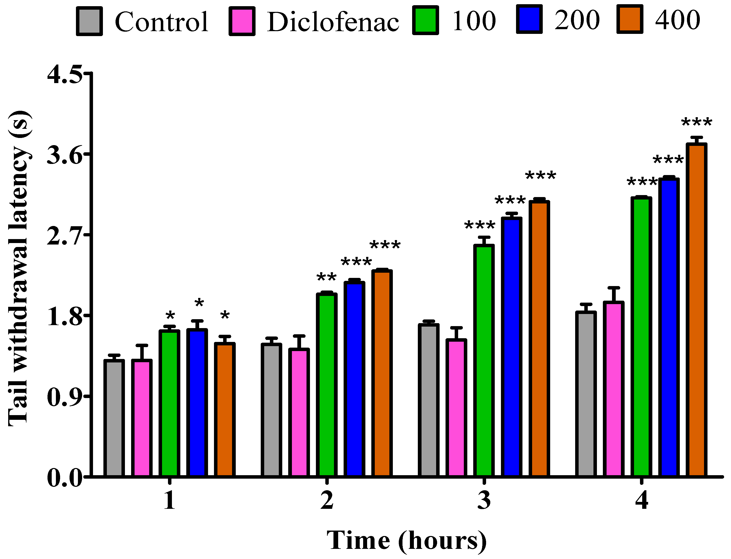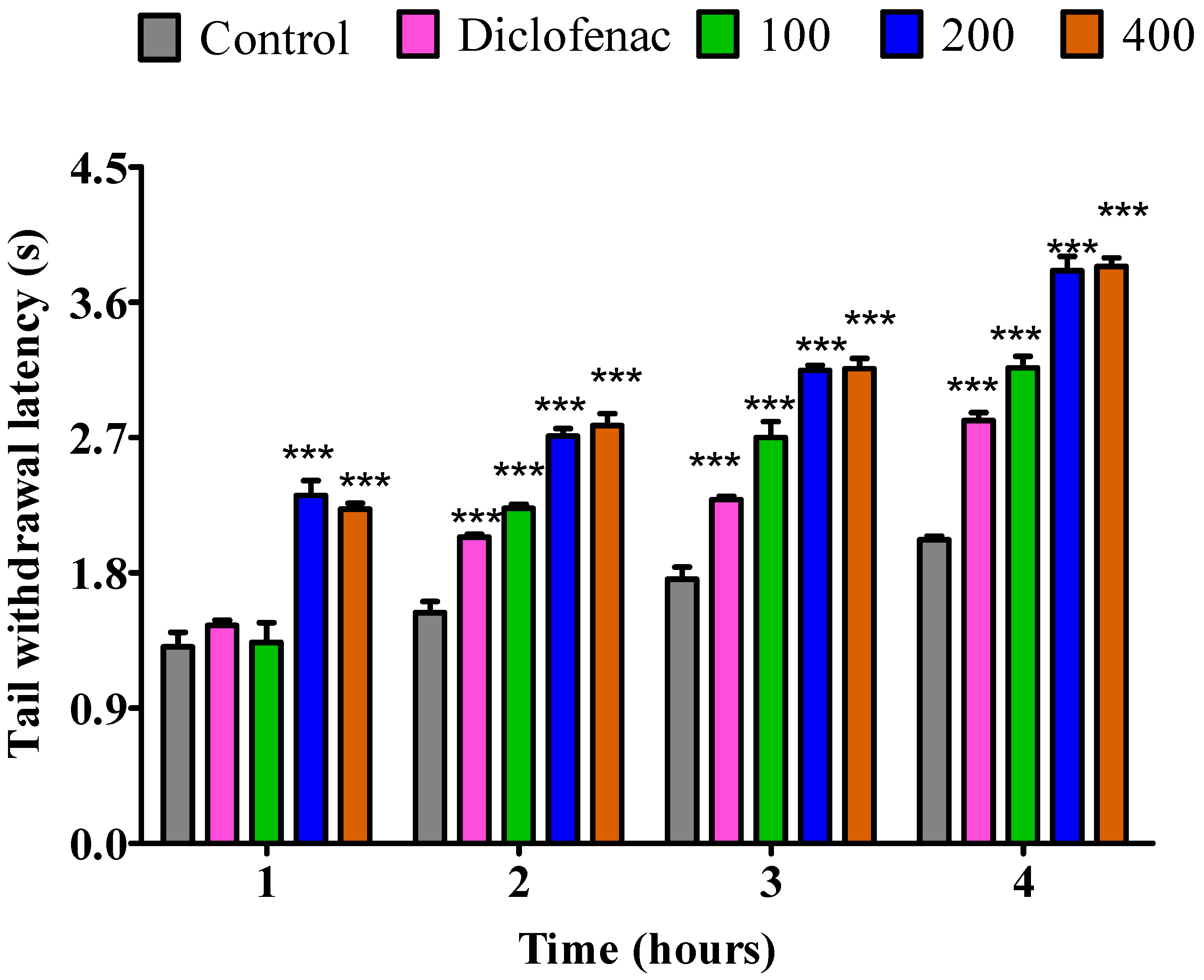 4.5.4. Analgesic Effect: Test of Tail Immersion
