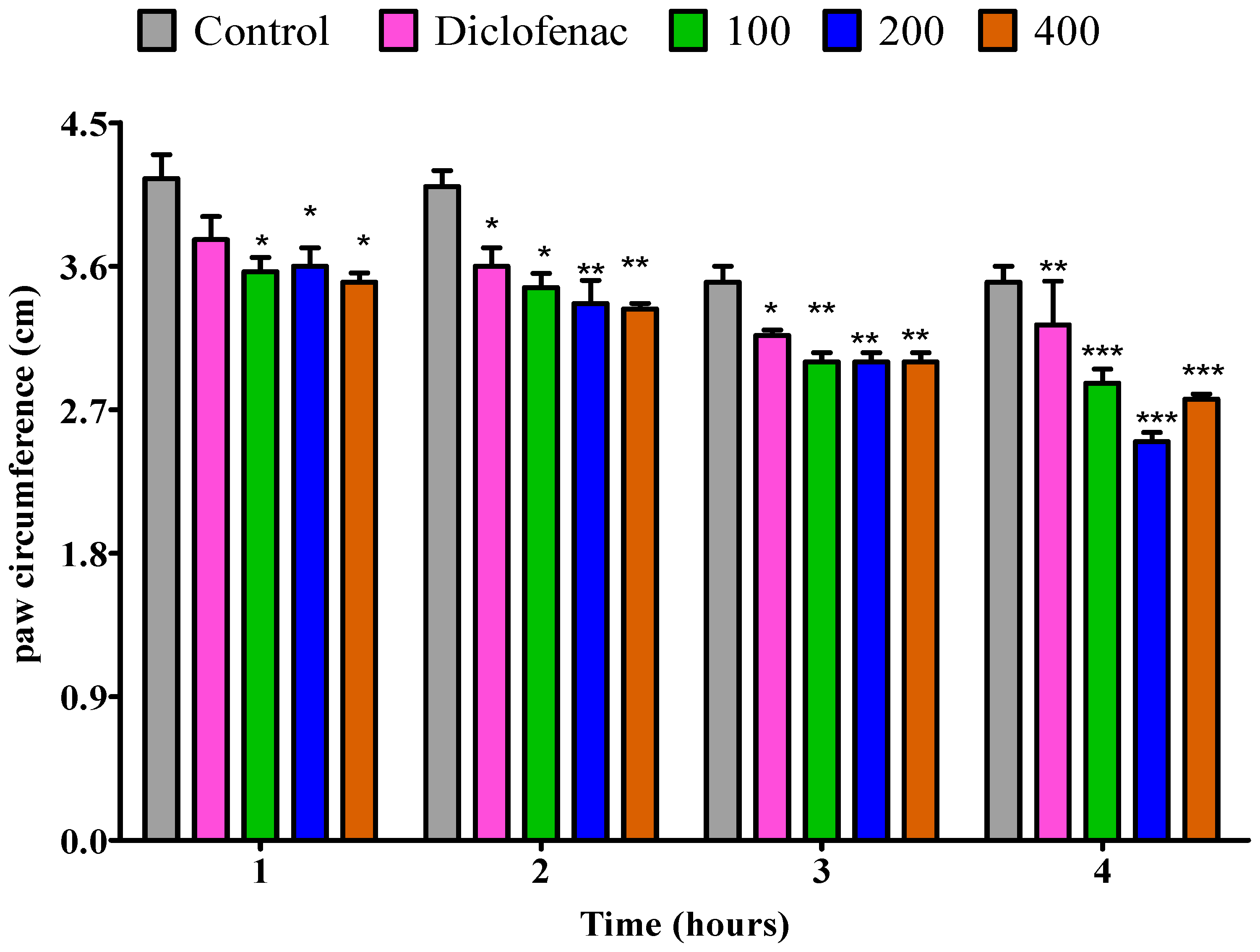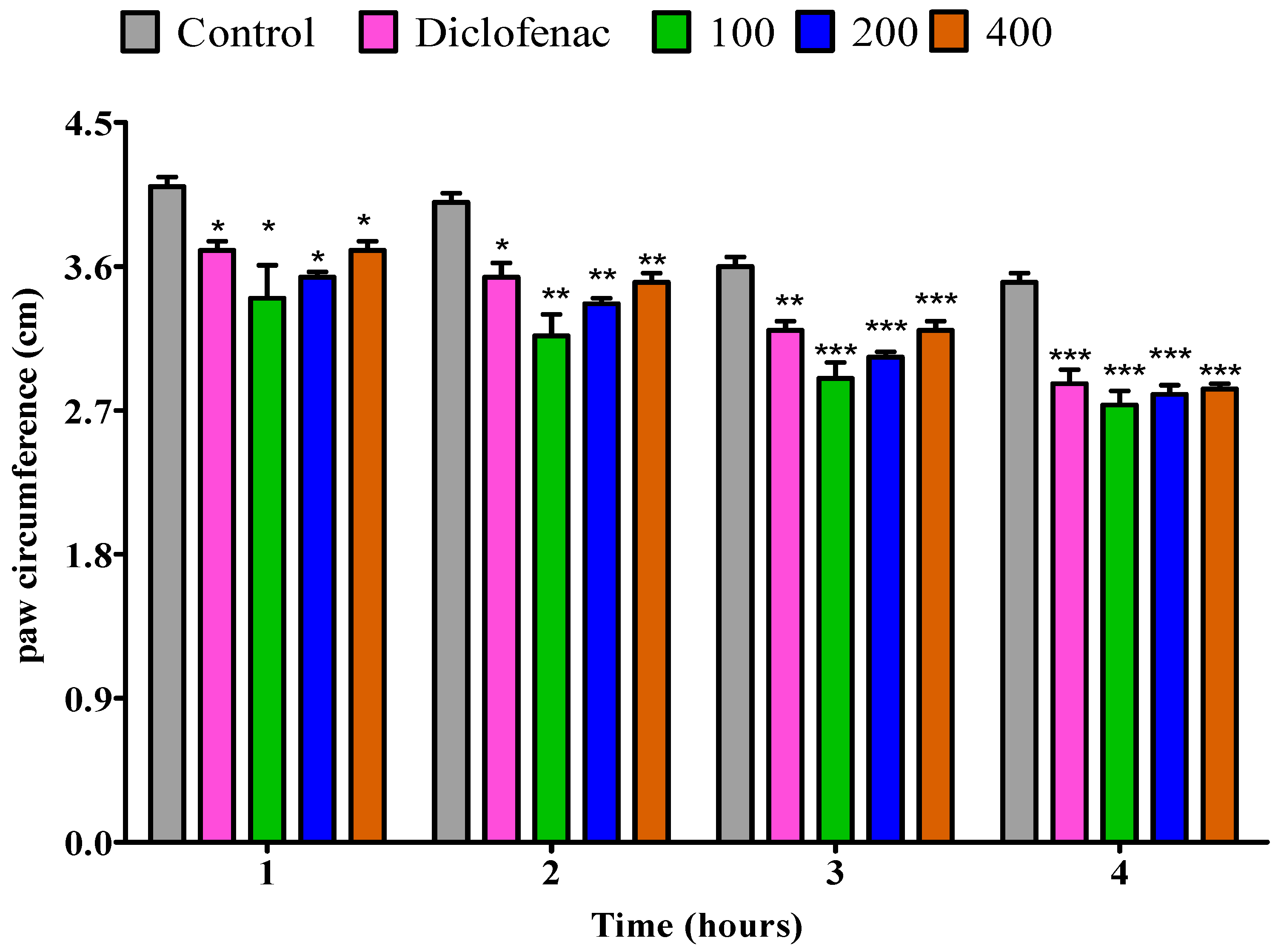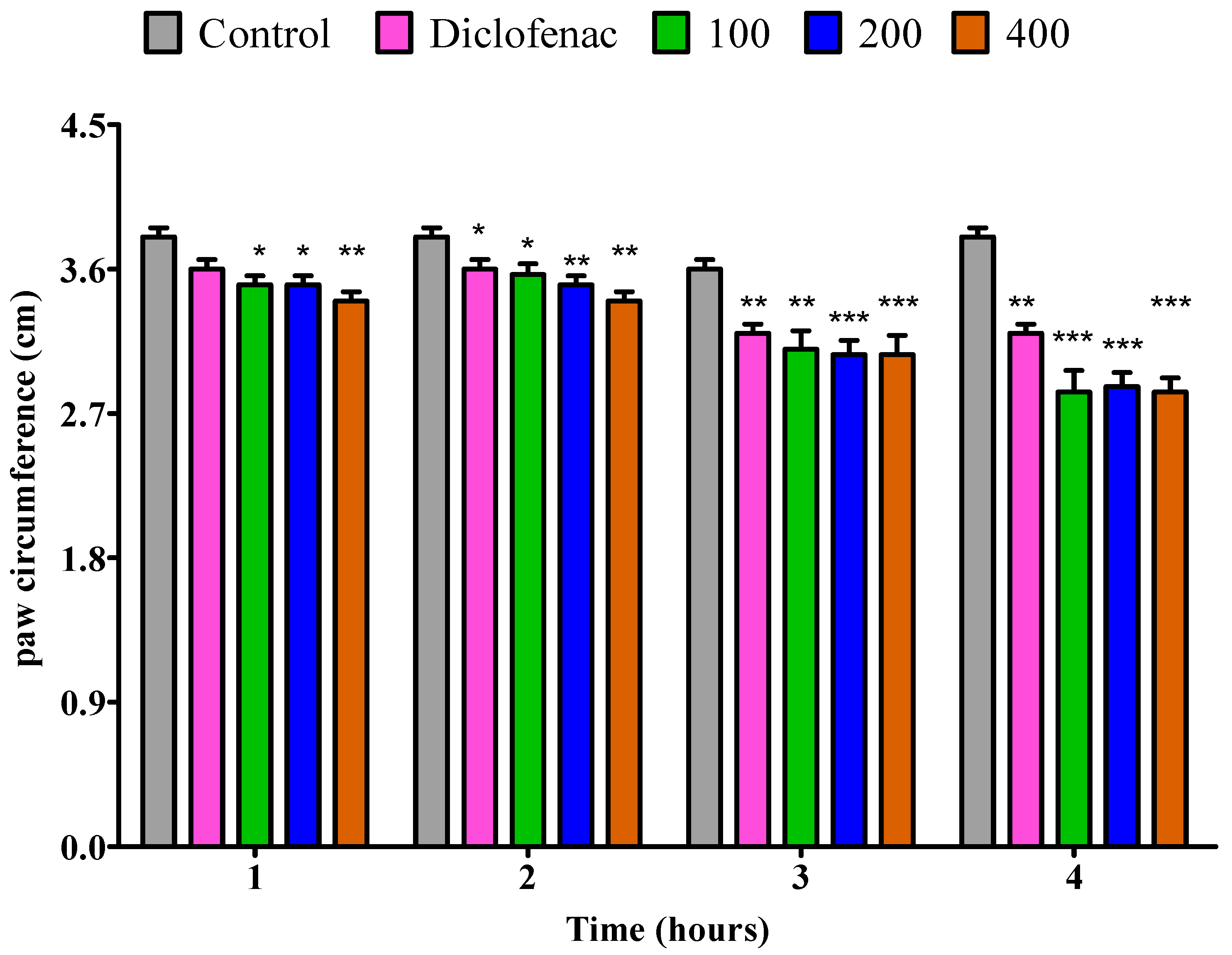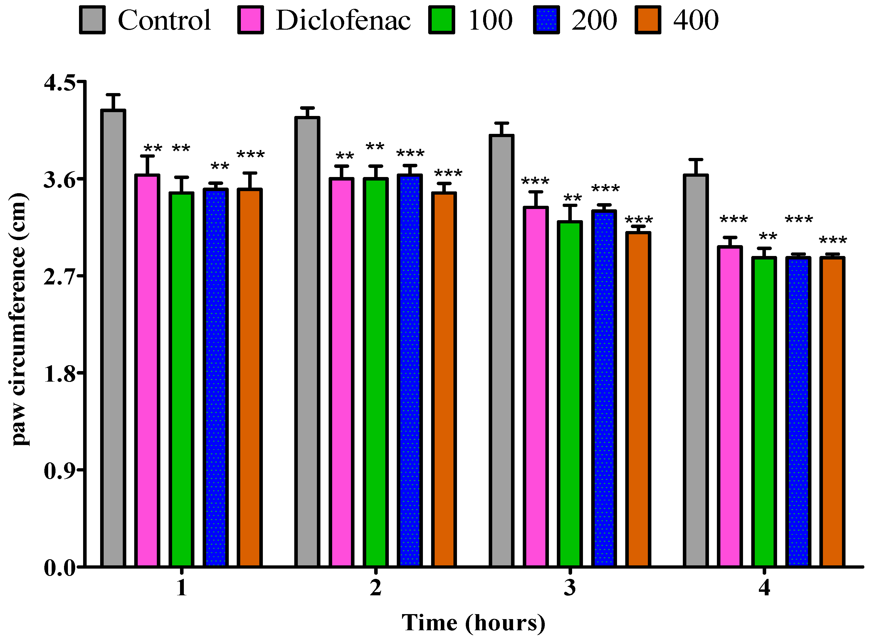 2.4.1. The Impact of the Essential Oil from Fresh P. odoratissimum Leaves on Rat’s Paw Edema Induced by Egg Albumin