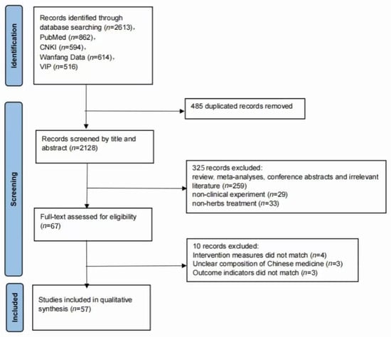 A comprehensive search of four databases yielded a total of 2128 retrieved articles. After screening according to the inclusion and exclusion criteria, 57 articles were finally included in the meta-analysis. The literature screening process is shown in Figure 1.