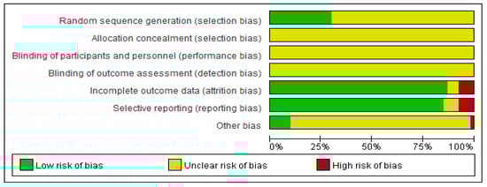 Seventeen studies explicitly described using a “randomized number table” for participant allocation, but none reported allocation concealment or blinding. Among them, one paper documented a high patient dropout rate without specifying causes or management strategies, which was deemed to pose a high risk of follow-up bias. Additionally, some studies lacked detailed reporting of adverse reactions in their outcome measures, precluding accurate assessment of reporting bias risk. The specific risk-of-bias profiles for individual studies are shown in Figure 2.