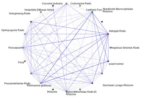 Drug frequency data were extracted from the 57 included studies: 149 single-herb medicines were used with a total frequency of 661. The frequency of each drug’s occurrence was sorted, and a total of 20 Chinese herbal medicines with a frequency of at least 10 appearances were identified as high-frequency drugs (i.e., the frequency of these herbs accounts for more than 20% of the total drug frequency). The top five herbs, in descending order of frequency, were Astragali Radix (Huangqi) (40 times), Angelicae Sinensis Radix (Danggui) (22 times), Glycyrrhizae Radix et Rhizoma (Gancao) (21 times), Codonopsis Radix (Dangshen) (20 times), and Poria (Fuling) (19 times). Subsequent high-frequency herbs included Hedyotidis Diffusae Herba (Baihuasheshecao) (18 times), Atractylodis Macrocephalae Rhizoma (Baizhu) (16 times), Salvia miltiorrhiza (Danshen) (16 times), Curcumae Rhizoma (Ezhu) (16 times), Persicae Semen (Taoren) (14 times), etc.