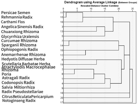 Hierarchical cluster analysis of the above high-frequency herbs was performed using SPSS Statistics 26.0 software. The intergroup linkage clustering method was employed, yielding six distinct clusters (Figure 4). The composition and characteristics of each cluster are as follows: