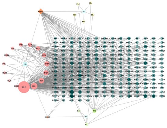 Network Analysis of Drug-Disease Targets in NSCLC. In the network diagram, dark green circular nodes represent potential targets, while blue nodes denote the herbs Scutellaria baicalensis (HQ), Poria cocos (FL), and Atractylodes macrocephala (BZ). The hexagonal nodes of various colors correspond to the active ingredients of these drugs.