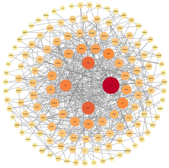 Core target PPI network diagram. Node size and color depth are proportional to the value of the degree.