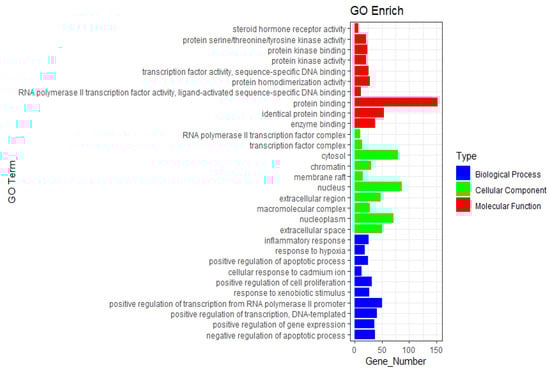 The Gene Ontology (GO) functional analysis yielded 807 entries, categorized into biological processes (BP), cellular components (CC), and molecular functions (MF), with 86 and 149 entries for CC and MF, respectively. The top 10 entries from each category were selected to construct enrichment bar charts for CC, MF, and BP (Figure 7). The analysis indicated significant intersections in biological processes between Astragali Radix, Atractylodis Macrocephalae Rhizoma, Poria, and NSCLC. BP primarily included responses to inflammation and hypoxia. CC predominantly comprised the cytoplasm, nucleus, and extracellular space. MF mainly involved ligand-activated sequence-specific DNA binding, protein binding, and enzyme binding activities (Figure 7).