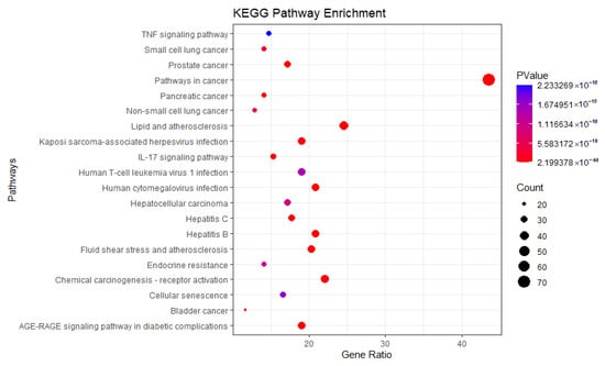 Kyoto Encyclopedia of Genes and Genomes (KEGG) pathway analysis identified potential signaling pathways, including the TNF signaling pathway, IL-17 signaling pathway, and AGE-RAGE signaling pathway, among others (Figure 8).