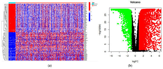 Heatmap (a) and Volcano Plot (b) of Differentially Expressed Genes. In the figure, black dots represent genes with no difference, green dots represent downregulated genes, and red dots represent upregulated genes.