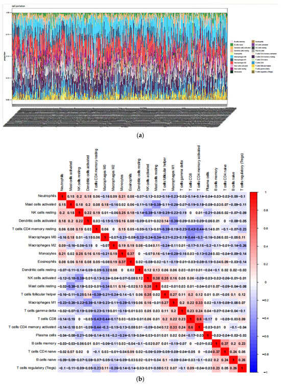 Correlation of Core Genes with Immune Infiltration Patterns. (a) Bar Chart of Immune Cell Proportions in Samples; (b) Correlation Matrix Plot of Immune Cells.
