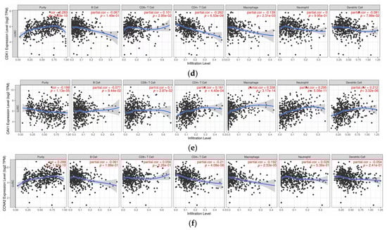 Scatter Plot Illustrating the Correlation Between Core Gene Expression and Immune Infiltrating Cells. (a) EGFR Expression Level; (b) FOS Expression Level; (c) CCL2 Expression Level; (d) CDK1 Expression Level; (e) CAV1 Expression Level; (f) CCNA2 Expression Level.