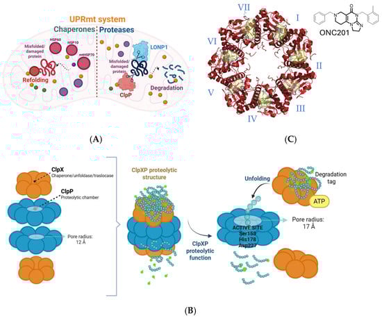 (A) Schematic representation of UPRmt system. Chaperones (HSP60, HSP10, mtHSP70) assist in refolding misfolded proteins, while proteases (LONP1, ClpP) degrade irreparably damaged proteins, thereby preserving mitochondrial proteostasis. (B) Schematic representation of the human ClpXP proteolytic complex. ClpX recognizes protein substrates via specific degradation tags and uses ATP hydrolysis to unfold them. The unfolded substrates are translocated into the proteolytic chamber of hClpP, where the catalytic triad (Ser153, His178, Asp227) cleaves them into small peptides that are released through lateral pores. (C) Seven ONC201 molecules bind to the hydrophobic pockets between ClpP subunits, promoting stabilization of the active tetradecameric complex.