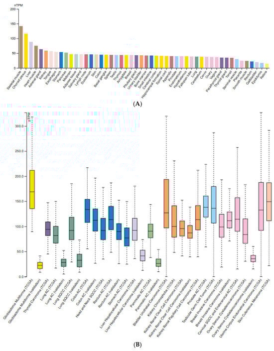 ClpP mRNA expression levels across normal (A) and tumor tissues (B); (A) Expression of ClpP in normal human tissues based on the Consensus dataset (v22, Human Protein Atlas), integrating RNA-seq data from GTEx, HPA, and FANTOM5. Values are reported as normalized transcripts per million (nTPM); (B) ClpP expression across various cancer types from TCGA RNA-seq dataset. Figures adapted from the Protein Atlas Database (v22.proteinatlas.org).