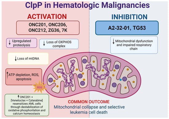 Both pharmacological activation and inhibition of ClpP converge on mitochondrial collapse and leukemic cell death. ClpP activators such as ONC201, ONC206, ONC212, ZG36, and 7k induce unregulated proteolysis, loss of OXPHOS complexes, mtDNA depletion, ATP loss, ROS accumulation, and apoptosis. Inhibition with A2-32-01 and TG53 disrupts respiratory chain function, also leading to mitochondrial dysfunction. Notably, ClpP activation synergizes with venetoclax plus cytarabine by destabilizing oxidative phosphorylation and calcium homeostasis. Despite distinct mechanisms, both strategies selectively impair leukemia survival.