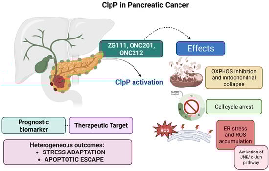 Pharmacological activation of ClpP by ZG111, ONC201, and ONC212 induces mitochondrial dysfunction in PDAC. Mechanistic effects include inhibition of OXPHOS, mitochondrial collapse, ATP depletion, cell cycle arrest, and ROS accumulation associated with ER stress and activation of the JNK/c-Jun pathway. ClpP expression also correlates with patient overall survival, highlighting its dual role as a prognostic biomarker and therapeutic target.