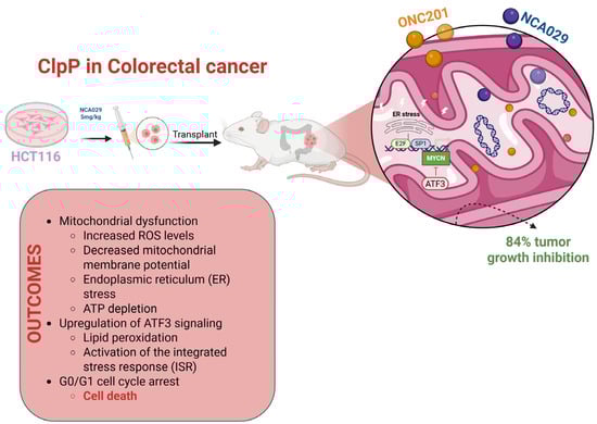 Schematic representation of the effects of ONC201 and NCA029 in HCT116 colorectal cancer models. Treatment induces mitochondrial dysfunction characterized by increased ROS levels, decreased mitochondrial membrane potential, ATP depletion, and ER stress. These alterations lead to upregulation of ATF3 signaling, lipid peroxidation, activation of the ISR, and G0/G1 cell cycle arrest, culminating in cell death. In xenograft models, NCA029 treatment resulted in 84% tumor growth inhibition, highlighting the therapeutic potential of ClpP-targeting compounds in colorectal cancer.