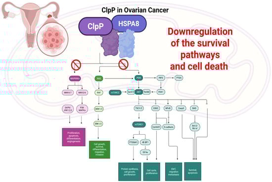 Epithelial ovarian cancer (EOC) remains one of the most lethal gynecologic malignancies, largely due to late-stage diagnosis and the frequent development of resistance to platinum-based chemotherapy [48,49,50]. Recent evidence has underscored the importance of mitochondrial dysfunction and proteostasis in chemotherapy response, highlighting the mitochondrial matrix protease ClpP as a promising therapeutic target.