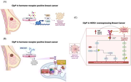The therapeutic potential of hClpP activation has been demonstrated across multiple tumor types. In acute myeloid leukemia (AML), ClpP activators can destroy leukemic stem cells and help defeat resistance to BCL-2 inhibitors [9,16,20,21,22]. In colorectal cancer, compounds such as ONC201 and IMP075 impair mitochondrial metabolism and induce apoptosis [3]. In prostate cancer, ONC201 is active in neuroendocrine differentiated tumors, although resistance may arise via lineage plasticity [23]. Gastric carcinoma shows differential ClpP expression associated with mitochondrial stress and carcinogenesis [24]. Pancreatic cancer cells respond to ONC201 through activation of the integrated stress response (ISR) induction and mitochondrial collapse [25]. In hepatocellular carcinoma (HCC), restoration of hClpP function improves steatohepatitis and reduces tumor development and progression [26]. In non-small cell lung cancer (NSCLC), ClpP activators like ZK53 collapse mitochondrial respiration and induce p53-independent cell death [7]. In breast cancer, ClpP activation sensitizes cells to Tumor Necrosis Factor-Related Apoptosis-Inducing Ligand (TRAIL) and enhances apoptotic signaling, particularly in HER2+ subtypes [27]. In ovarian cancer, ClpP is stabilized by HSPA8, a chaperone protein belonging to the HSP70 family, and contributes to cisplatin resistance, indicating a potential role in the regulation of chemoresistance [28]. In brain tumors, especially H3K27-altered diffuse midline glioma (DMG H3K27-altered), ONC201 induces ClpP dependent metabolic stress and is under evaluation in clinical trials such as the recruiting PNOC022 [29].