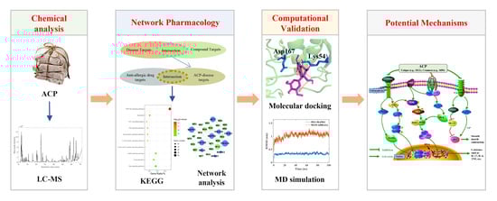 Chicago/Turabian StyleHong, Liang, You Qin, Chiwai Ip, Wenfei Xu, Haoxuan Zeng, Xiu Duan, Ji Wang, Jing Zhao, Qi Wang, and Shaoping Li. 2025. "Characterization and Anti-Allergic Mechanisms of Bioactive Compounds in a Traditional Chinese Medicine Prescription Using UHPLC-Q-TOF-MS/MS, Network Pharmacology and Computational Simulations" Pharmaceuticals 18, no. 10: 1444. https://doi.org/10.3390/ph18101444