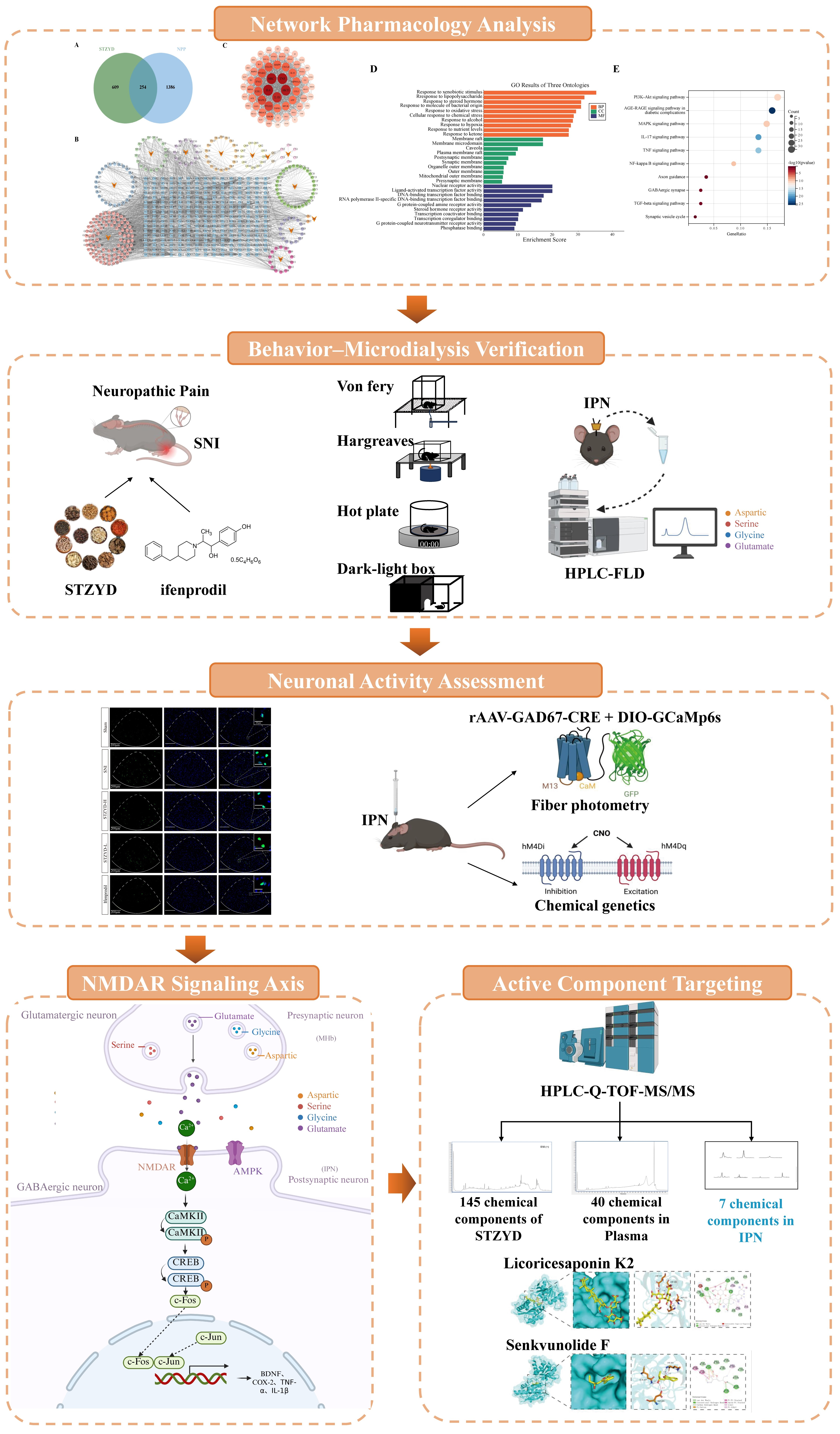 NPP is one of the most intractable and debilitating forms of chronic pain, arising from disease or injury anywhere along the somatosensory pathway. From peripheral nociceptors to spinal dorsal horn neurons and from ascending tracts to cortical networks, maladaptive changes can initiate and perpetuate pain signaling at each level. In this context, central sensitization, driven by synaptic plasticity within the central nervous system (CNS), has emerged as the key mechanism by which transient peripheral insults are “memorized” as persistent pain. In this complex mechanism, network pharmacology provides a novel perspective. By integrating information at the molecular, cellular, and systems levels, network pharmacology facilitates the identification of key signaling pathways and therapeutic targets in NPP, thereby offering a multidimensional strategy for alleviating chronic pain. Accordingly, in this study, we first employed network pharmacology to predict the potential mechanisms by which STZYD exerts therapeutic effects on NPP, and we subsequently validated these predictions in animal experiments. Molecular, histological, and morphological analyses further demonstrated that NMDAR2B may serve as a critical membrane-associated target, suggesting that STZYD might modulate synaptic transmission in line with mechanisms involving NMDAR-mediated excitotoxicity and central sensitization. In addition, functional neuroscience experiments confirmed the role of GABAergic neurons within the IPN. Moreover, HPLC-Q-TOF-MS/MS analysis revealed that STZYD is capable of crossing the blood–brain barrier to reach the IPN and exhibits high affinity toward the NMDAR2B receptor.