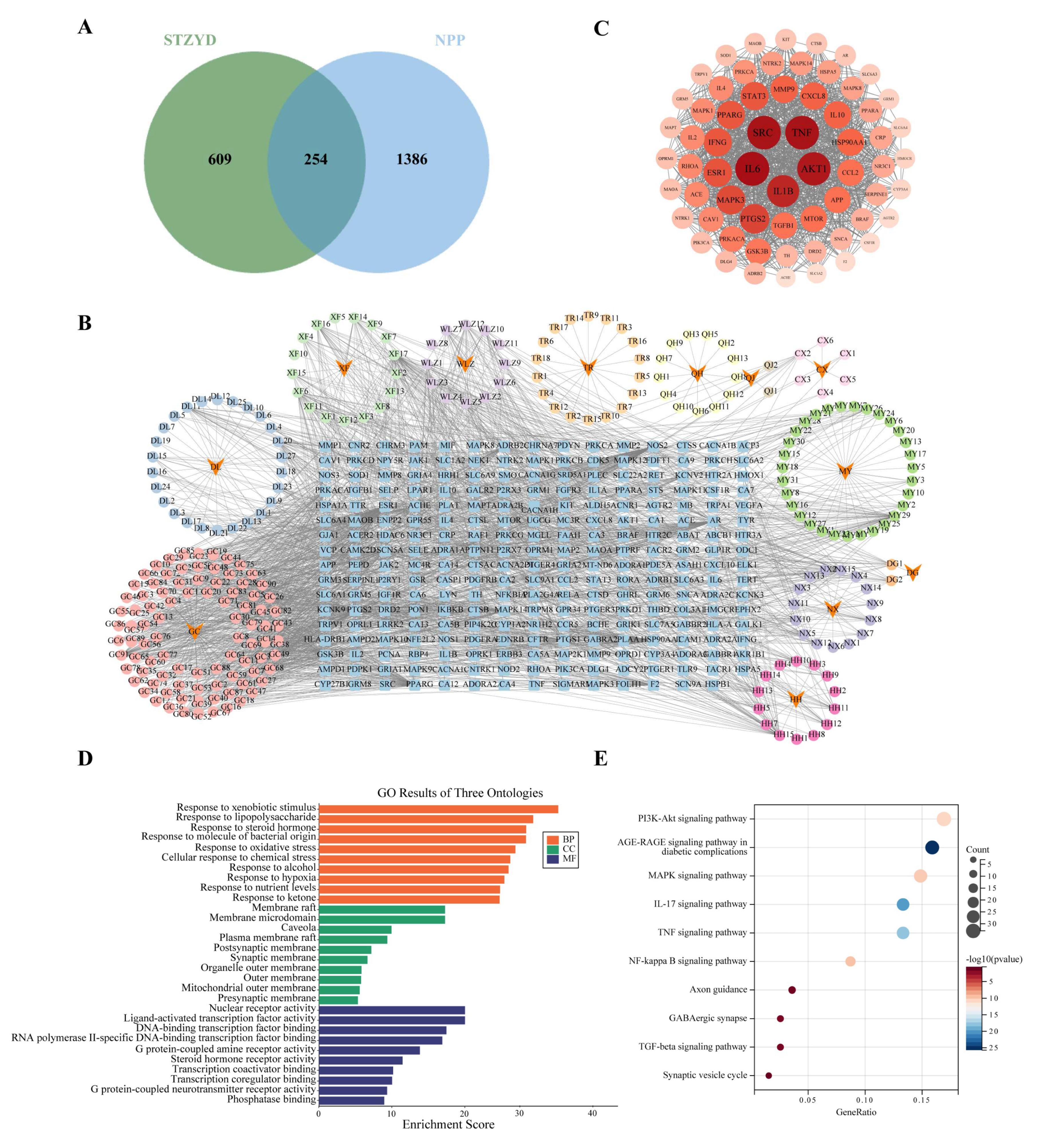 Figure 1. Network pharmacology prediction of Shentong Zhuyu Decoction (STZYD) in the treatment of NPP. (A) Venn diagram showing the overlap between STZYD and NPP. (B) Compound–target–pathway–disease network. Inverted triangles represent the herbal components, circles represent the active-ingredient targets, and squares represent disease nodes. (C) Protein–protein interaction (PPI) network of candidate targets obtained from the STRING database and visualized using Cytoscape 3.7.2. (D) Top 30 enriched Gene Ontology (GO) terms of STZYD candidate targets, including biological processes (BPs), cellular components (CCs), and molecular functions (MFs). (E) Top 10 enriched KEGG pathways of STZYD candidate targets. The x-axis represents the enrichment ratio, the circle sizes indicate the numbers of enriched genes, the y-axis denotes the KEGG pathways, and the different colors represent the adjusted p values.