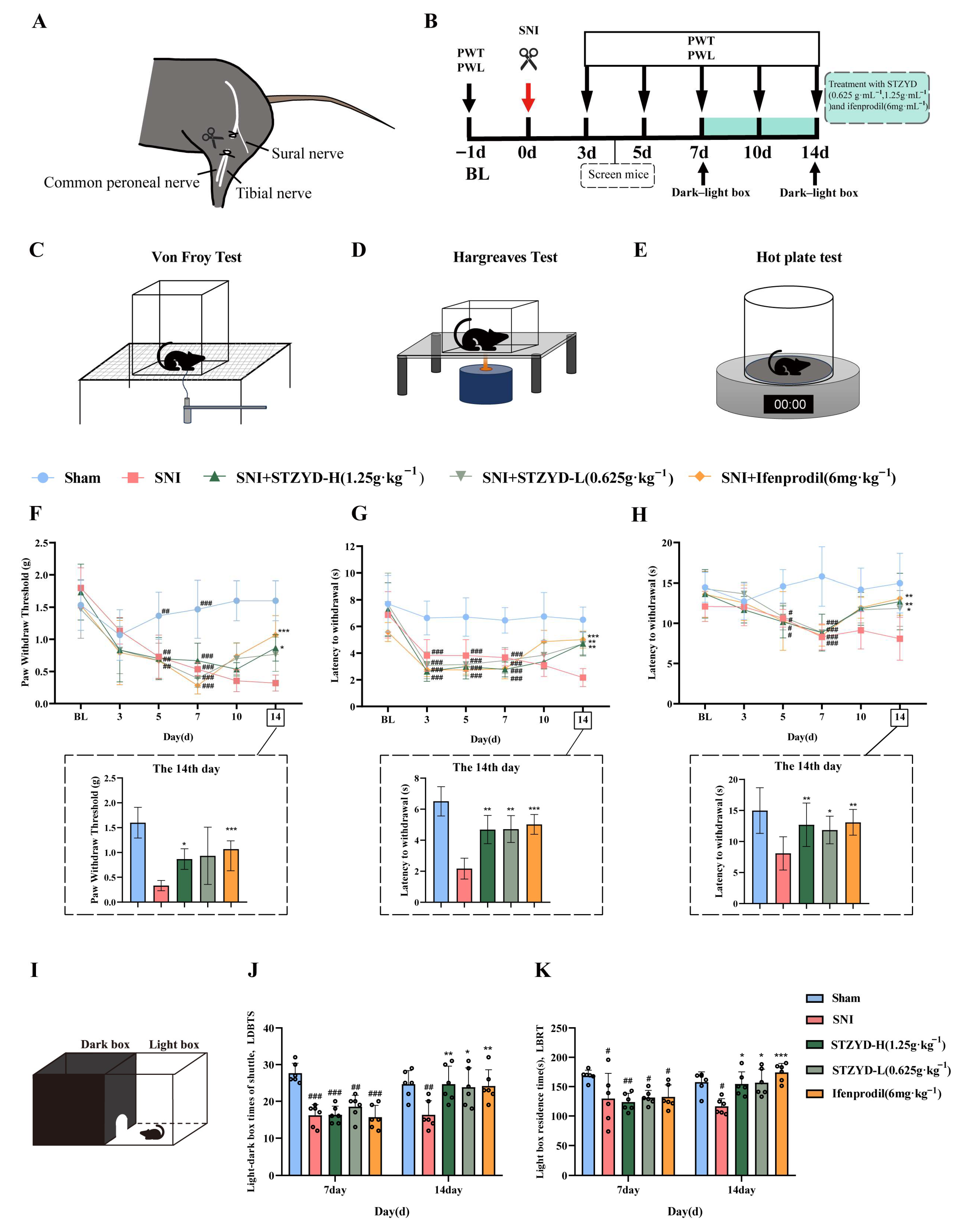 Figure 2. STZYD effects on pain behaviors in spared nerve injury (SNI) mice. (A) Schematic diagram of the spared nerve injury surgery, in which the tibial and common peroneal nerves were transected and ligated, while the sural nerve was preserved. (B) Timeline illustrating the schedule of the model establishment and behavioral testing. (CE) These panels depict the schematic diagrams of the von Frey, Hargreaves, and hot-plate tests, respectively. (F) Mechanical pain thresholds of the plantar surface of the left hind paw measured over time in each group. The bar graph specifically represents the paw withdrawal threshold on day 14. (G) Paw withdrawal latency in response to thermal stimuli recorded using the Hargreaves test. The corresponding bar graph represents the paw withdrawal thermal latency on day 14. (H) Thermal paw withdrawal latency assessed in each group over time using the hot-plate test. The bar graph represents the latency on day 14. (I) Schematic diagram of the light–dark-box test. (J) The number of times mice in each group crossed the light–dark boxes in the light–dark-box experiments. (K) The residence time of mice in the light box in each group in the light–dark-box experiments. BL: Basal pain threshold of mice before modeling. One-way ANOVA was used to analyze all the behavioral data. All data are expressed as means ± SEMs (n = 6). # represents the comparison with the Sham group, and * represents the comparison with the SNI group. # p < 0.05, ## p < 0.01, and ### p < 0.001; * p < 0.05, ** p < 0.01, and *** p < 0.001.