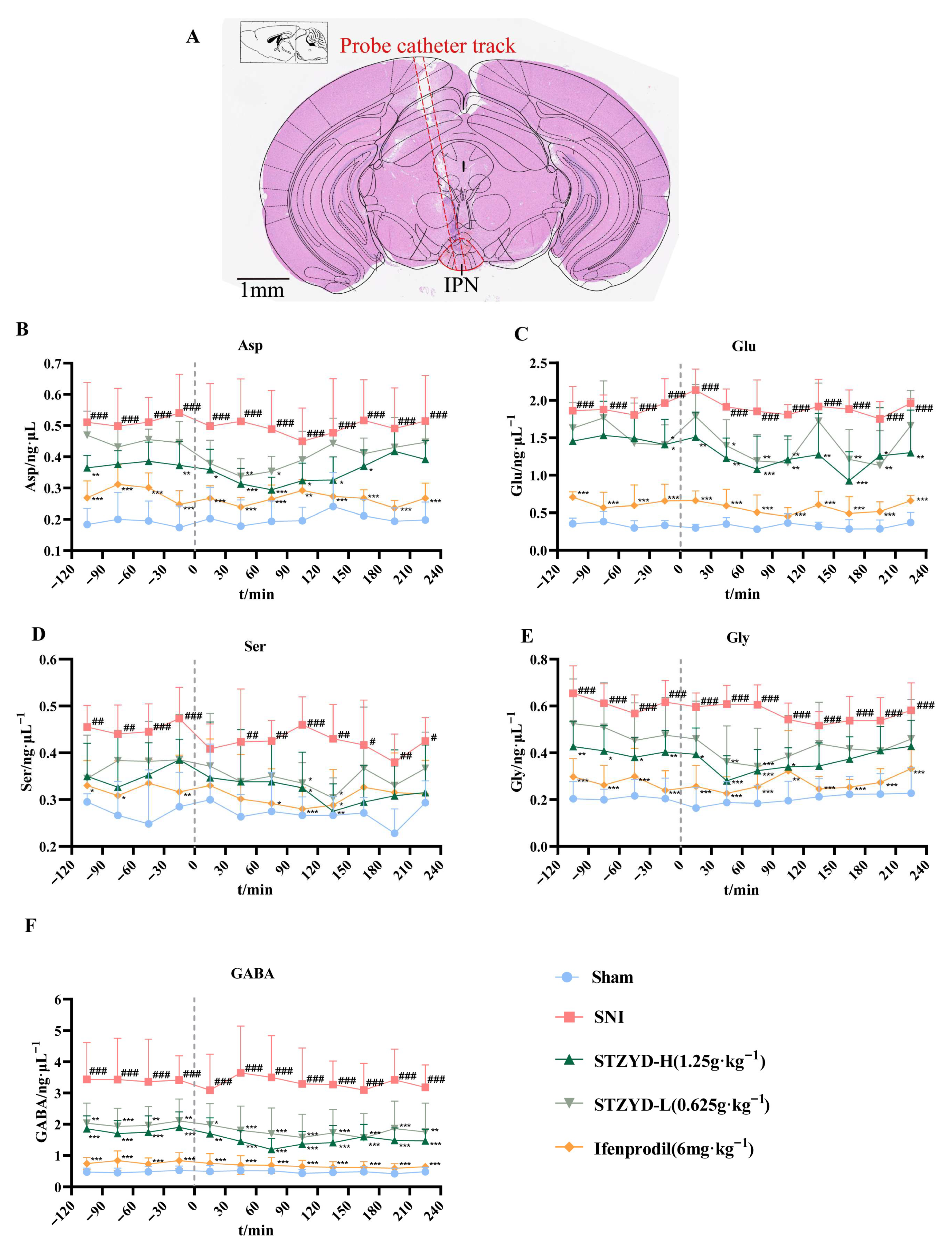 Figure 3. STZYD effects on amino acid neurotransmitters in interpeduncular nucleus (IPN). (A) Schematic diagram of the position of the microdialysis probe implanted in the IPN after HE staining. (BF) STZYD effects on the Asp, Glu, D-Ser, Gly and GABA contents in the extracellular fluid of the IPN ( x ¯ ± s; all data are expressed as means ± SEMs, n = 6). Two-way ANOVA was used to analyze the HPLC data. Compared with the Sham group, # p < 0.05, ## p < 0.01, and ### p < 0.001. Compared with the SNI group, * p < 0.05, ** p < 0.01, and *** p < 0.001.