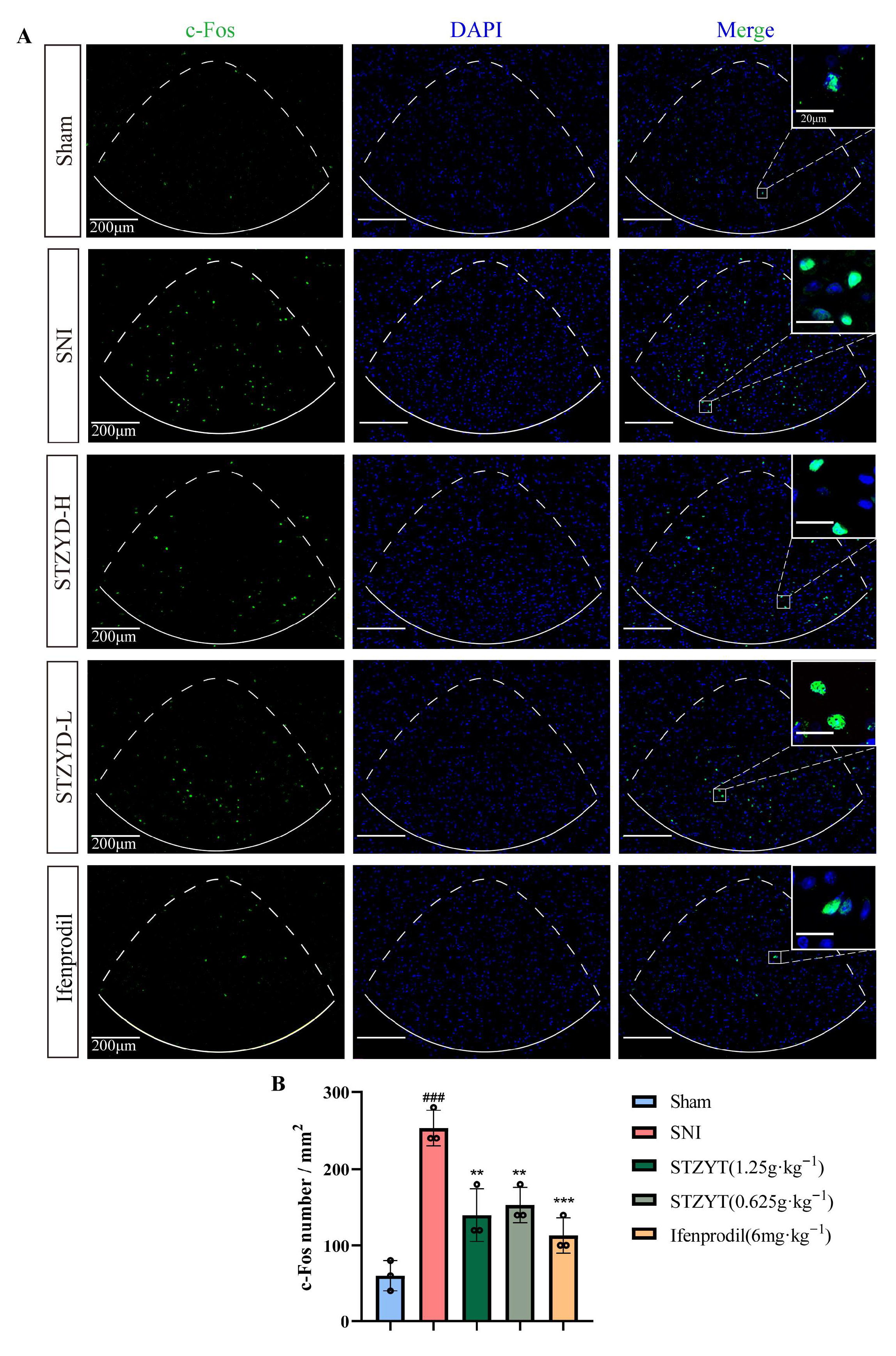 Figure 4. Regulation of c-Fos expression in the IPN via STZYD. (A) Representative immunofluorescence images showing c-Fos protein expression in the IPN across different experimental groups (scale bar: 200 μm; magnification: 10×; n = 3). (B) Quantification of c-Fos-positive neurons presented as number of labeled cells per mm2 of IPN tissue across treatment groups ( x ¯ ± s; data are presented as means ± SEMs, n = 3). One-way ANOVA was used to analyze the number of cells in the immunofluorescence experiment. # represents the comparison with the Sham group, and * represents the comparison with the SNI group. ### p < 0.001, ** p < 0.01, and *** p < 0.001.