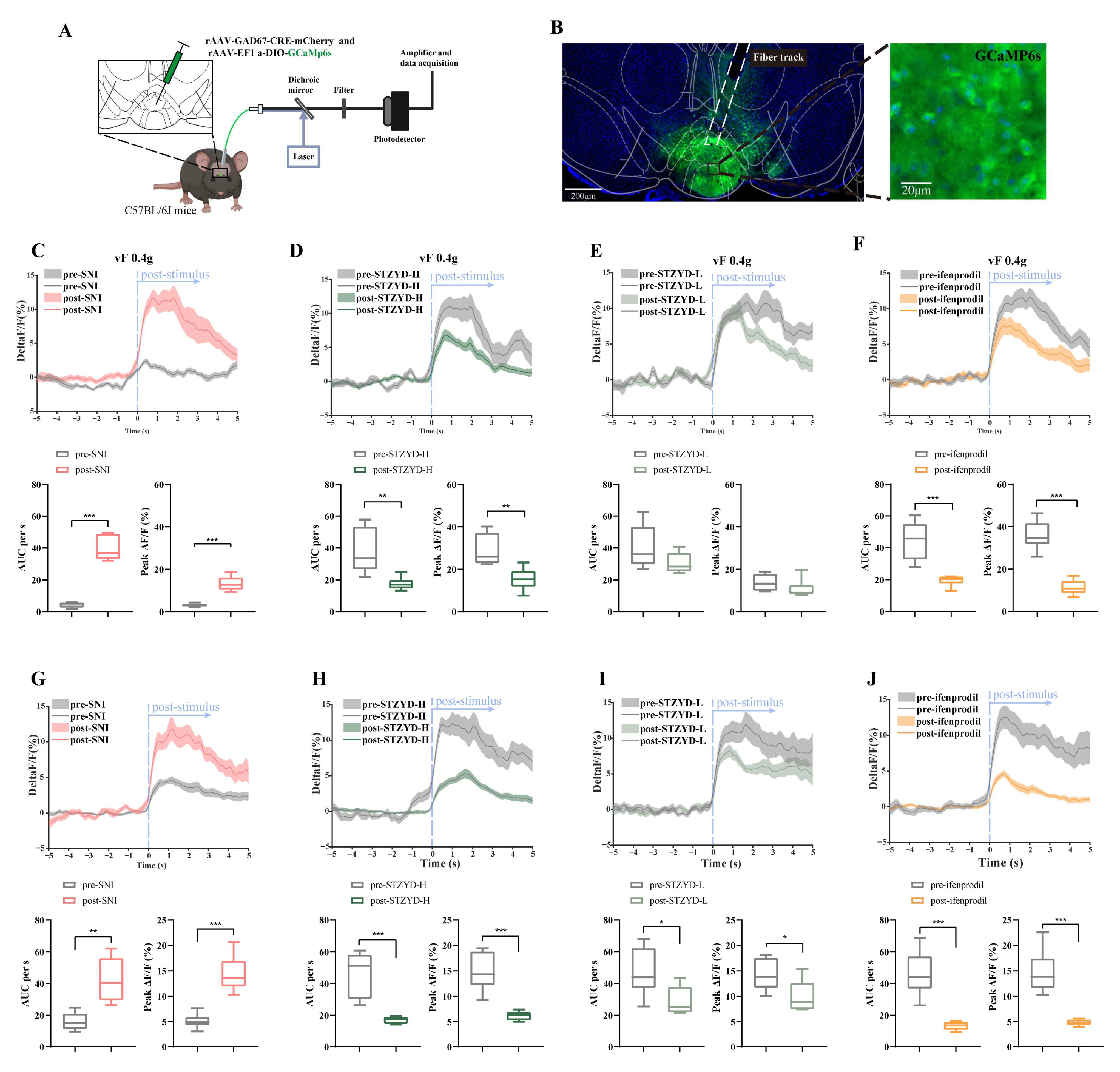 To investigate the in vivo activity of IPN GABAergic neurons in response to nociceptive stimuli, we employed the Cre-dependent gene delivery of the calcium indicator GCaMP6s into the IPNs of C57BL/6 mice using adeno-associated virus serotype 2/9 (AAV2/9) under the control of the GAD67 promoter (Figure 5A). The viral injection site within the brain region of the IPN is illustrated in Figure 5B. Fiber photometry was used to monitor calcium transients in response to Von Frey filament stimulation, enabling the real-time recording of neuronal activity. Three weeks after viral transduction, mice underwent SNI surgery. Calcium signals were recorded both prior to surgery and one week post-SNI to assess neuronal activity changes. Following postoperative recordings, mice received a one-week treatment with either high- or low-dose STZYD or ifenprodil, after which calcium imaging was conducted again. As shown in Figure 5C,G, mechanical stimulation using a 0.4 g Von Frey filament and thermal stimulation via radiant heat induced a robust increase in the GCaMP signals in the SNI model mice. Quantitative analysis of the recorded signals revealed a significant elevation in both the area under the curve (AUC) and mean peak amplitude compared to the preoperative baseline levels (Figure 5C,G), indicating the enhanced excitability of GAD67+ neurons within the IPN following peripheral nerve injury. Notably, treatment with high-dose STZYD or ifenprodil resulted in a marked reduction in GCaMP signals, as reflected by the significant decreases in both the AUC and mean peak amplitude (Figure 5D,F), suggesting that these interventions effectively attenuated injury-induced neuronal hyperactivity. In contrast, the low-dose STZYD group did not exhibit statistically significant GCaMP signal intensity, AUC, or peak amplitude changes, indicating the dose-dependent effect of the STZYD treatment. Interestingly, the low-dose STZYD group showed significant GCaMP signal reductions under thermal stimulation conditions (Figure 5I), with significant decreases in both the AUC and mean peak amplitude. Similarly, both the high-dose STZYD and ifenprodil treatment groups demonstrated the pronounced attenuation of heat-induced responses, as evidenced by the significantly reduced AUC and mean peak amplitude levels relative to the pre-treatment levels (Figure 5H,J).