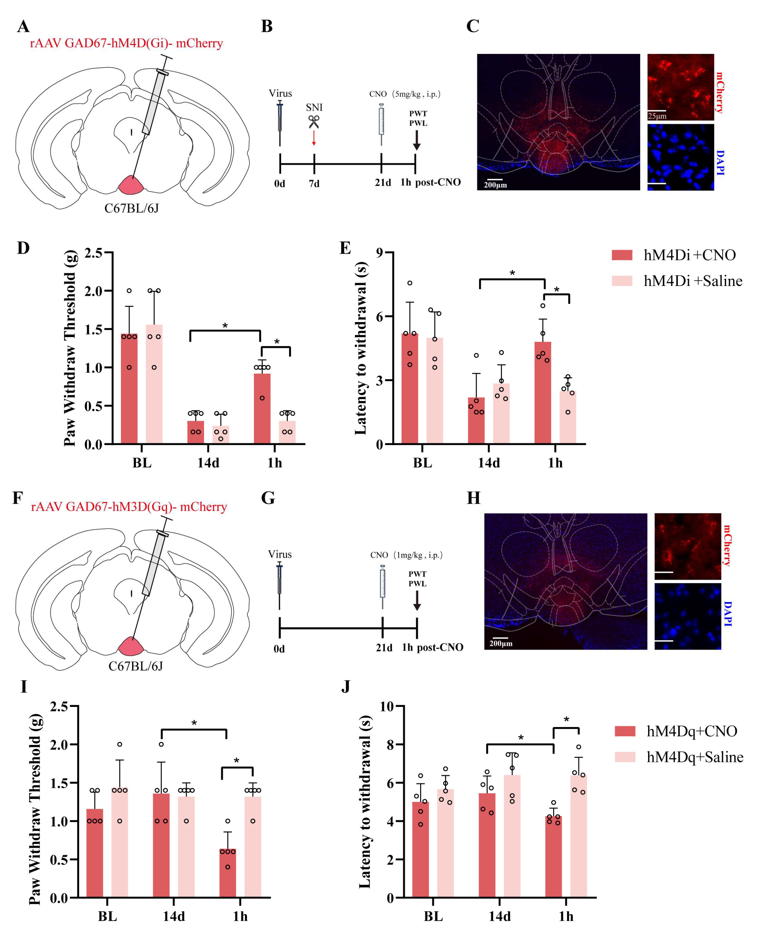 Figure 6. Effects of chemogenetic activation/inhibition of IPN GABAergic neurons on pain behavior. (A) Schematic representation of the viral (Gi) injection sites within the IPN (coronal section). (B) Experimental timeline illustrating the procedures. (C) Representative image showing hM3Di expression (red) in the IPN under the control of the GAD67 promoter; nuclei are counterstained with DAPI (blue). rAAV-GAD67-hM4D(Gi)-mCherry-WPREs (300 nL, 5.27 × 1012 vg/mL) were injected into the IPN. (D) Changes in mechanical pain thresholds at baseline, 14 days post-SNI, and following CNO administration in SNI and control mice. (E) Changes in thermal pain thresholds at baseline, 14 days post-SNI, and following CNO administration in SNI and control mice. (F) Schematic representation of the viral (Gq) injection sites within the IPN (coronal section). (G) Experimental timeline illustrating the procedures. (H) Schematic representation of the viral injection sites expressing hM3Dq (red) within the IPN (coronal section); nuclei are counterstained with DAPI (blue). rAAV-GAD67-hM4D(Gq)-mCherry-WPREs (300 nL, 6.04 × 1012 vg/mL) were injected into the IPN. (I) Changes in mechanical pain thresholds at baseline, 14 days post-injection, and following CNO administration in naïve and control mice. (J) Changes in thermal pain thresholds at baseline, 14 days post-injection, and following CNO administration in naïve and control mice. All data are expressed as means ± SEMs, n = 5. Compared with the hM4Di/hM4Dq+CNO group, * p < 0.05.