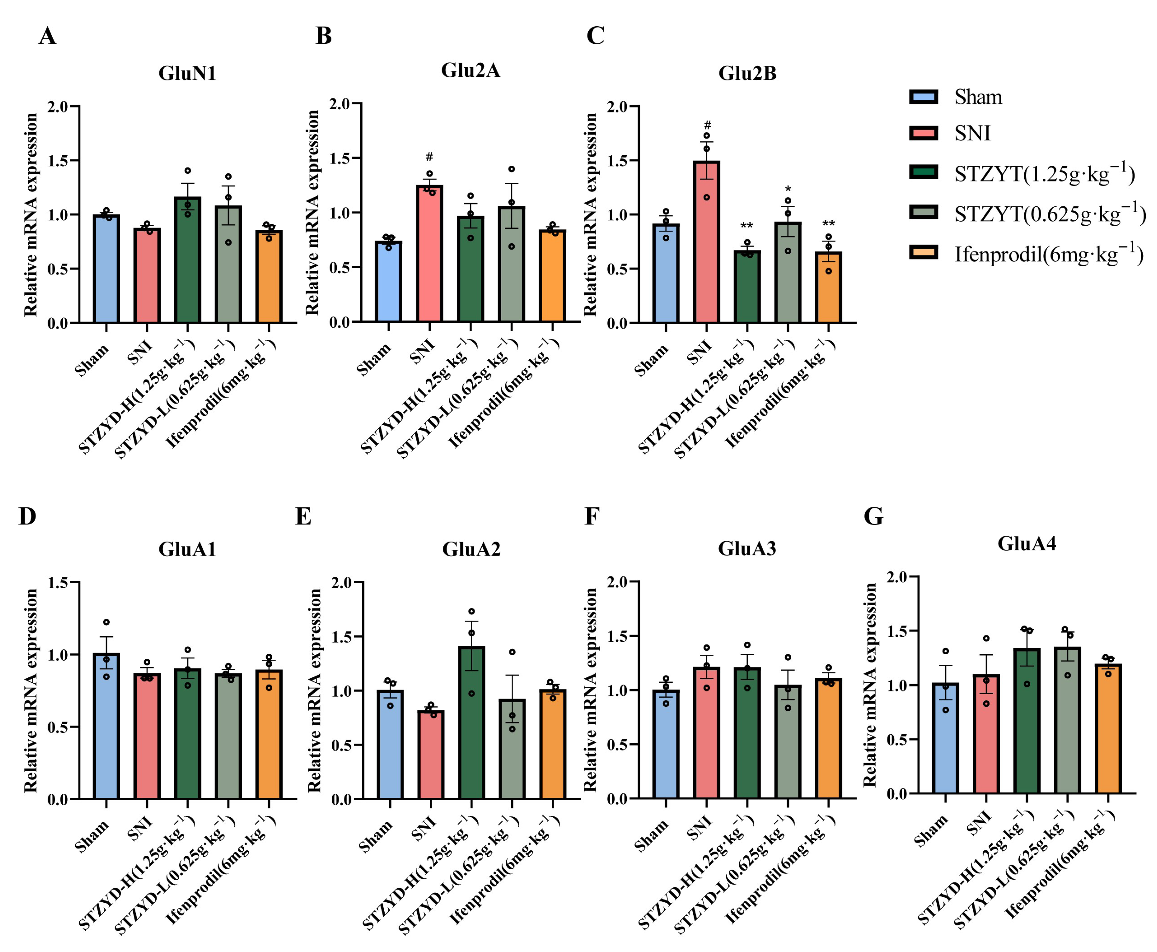 Figure 7. STZYD influence on glutamate receptor expression. (AG) Relative mRNA levels of GluN1, GluN2A, GluN2B, and GluA1–GluA4 were quantified via RT-qPCR with GAPDH as the internal control. Data were analyzed by one-way ANOVA and are presented as means ± SEMs (n = 3). # represents the comparison with the Sham group, and * represents the comparison with the SNI group. # p < 0.05, * p < 0.05, and ** p < 0.01.