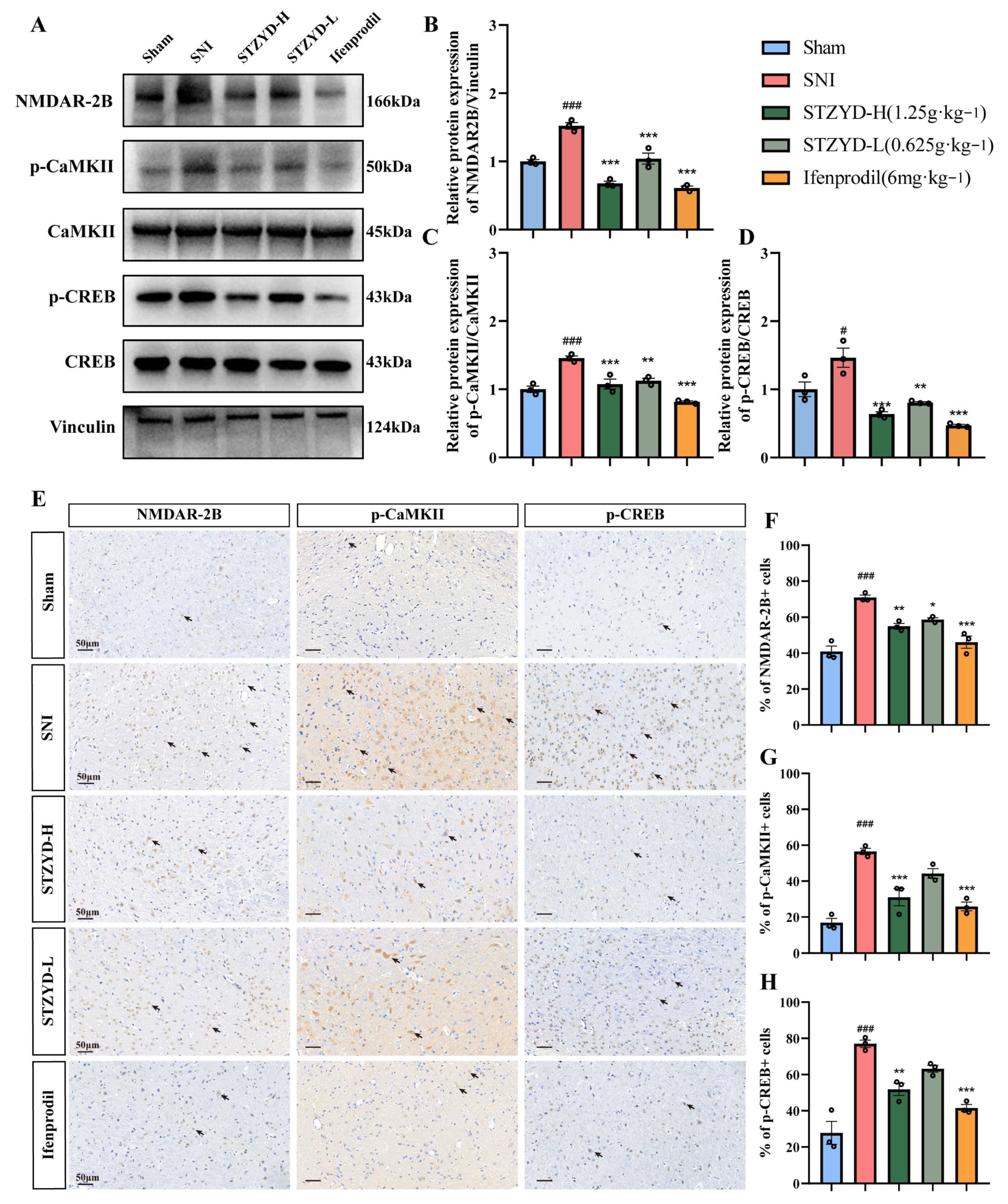 Figure 8. STZYD effects on the NMDAR-2B/CaMKII/CREB signaling pathway. (A) Western blotting was used to detect the expressions of NMDAR-2B, CaMKII, p-CaMKII, CREB, p-CREB, and Vinculin proteins in the IPN. (B) Relative protein expression levels of NMDAR-2B receptor. (C) Relative protein expression levels of p-CaMKII. (D) Relative protein expression levels of p-CREB. (EH) Representative immunohistochemical images and statistical analysis of each group showing the positive areas of NMDAR-2B, p-CaMKII, and p-CREB in the IPN (scale bar: 50 μm; magnification 40×; n = 3). Black arrows indicate IPN neurons immunopositive for NMDAR-2B, p-CaMKII, or p-CREB. One-way ANOVA was used to analyze the protein expression levels and positive cell rates of NMDAR-2B, p-CaMKII, and p-CREB. All data are expressed as means ± SEMs, n = 3. Compared with the Sham group, # p < 0.05, and ### p < 0.001. Compared with the SNI group, * p < 0.05, ** p < 0.01, and *** p < 0.001.