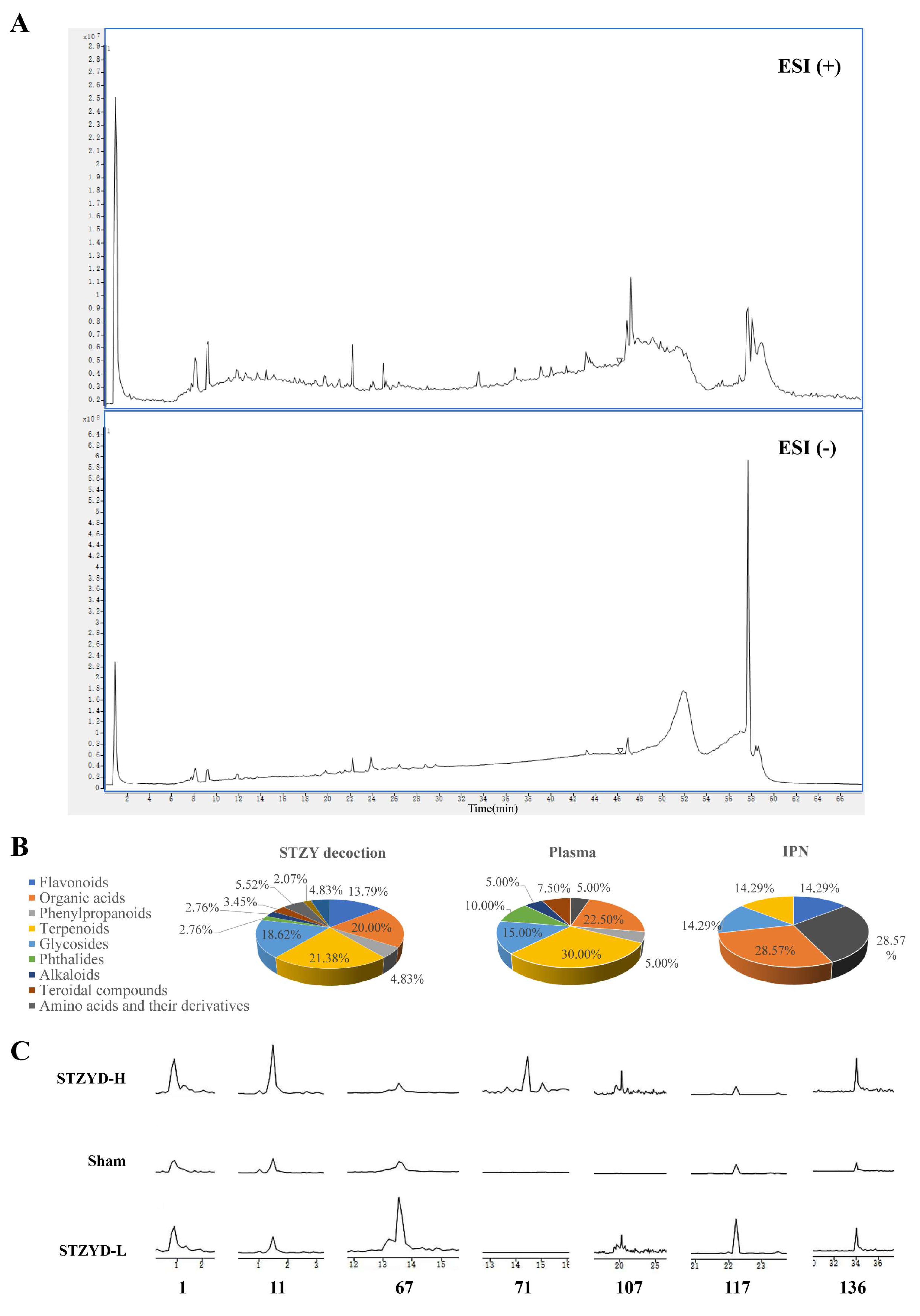 Figure 9. Identification of STZYD components. (A) Total ion chromatograms (TICs) of STZYD extracted with 50% methanol in both positive- and negative-ion modes, analyzed via HPLC-Q-TOF-MS/MS. (B) Pie chart showing the relative percentages of different chemical groups detected in STZYD, plasma, and INP samples via HPLC-Q-TOF-MS/MS. (C) EICs of components extracted from the IPNs of the STZYD-L, STZYD-H, and Sham groups. From left to right, the following compounds were sequentially detected: L-arginine, azelaic acid, formononetin, licoricesaponin K2, senkyunolide F, L-isoleucine, and lauric acid.