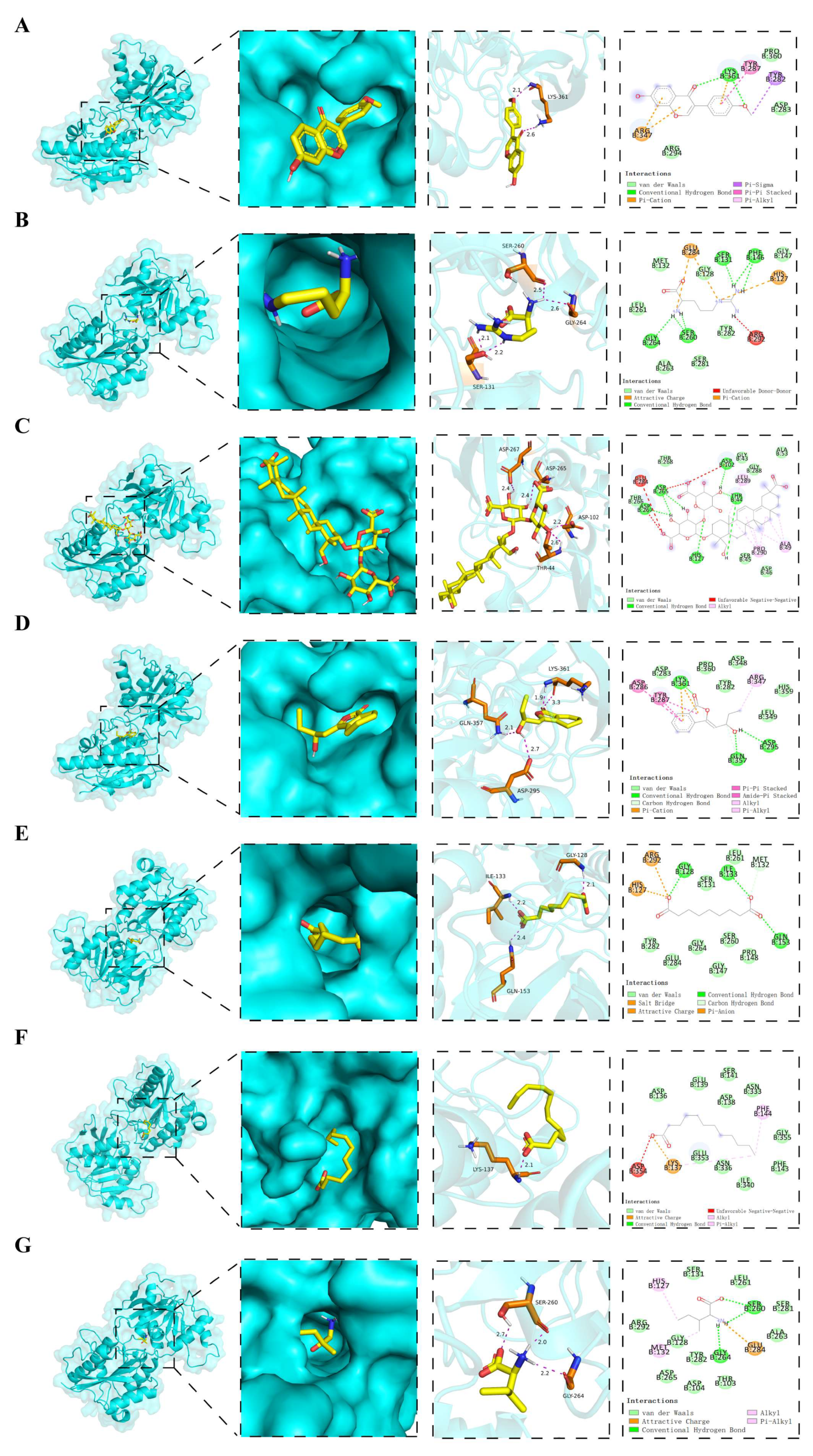 Figure 10. Molecular docking between NMDAR-2B and four pivotal ligands. The molecular docking results between NMDAR-2B and seven pivotal ligands, namely, (A) formononetin, (B) L-arginine, (C) licoricesaponin K2, (D) senkyunolide F, (E) azelaic acid, (F) lauric acid, and (G) L-isoleucine. Left: The small-molecule ligand (yellow) is embedded within the binding pocket of the NMDAR-2B subunit, with the receptor visualized as a cyan, solid surface. Middle: A stick model highlights key hydrogen bond interactions between the ligand (yellow) and critical residues; the receptor backbone is shown as a semi-transparent ribbon. Right: A two-dimensional schematic illustrates the ligand–protein interactions. Legend: green, solid lines—conventional hydrogen bonds; orange, dashed lines—salt bridges; red, dashed lines—attractive electrostatic interactions; light-green-filled circles—van der Waals forces; gray, dashed lines—carbon–hydrogen bonds; yellow, dashed lines—π–anion interactions.