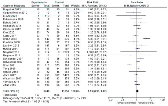 Comparing the differences in complications from the administration of INFL in relation to the CNTRL group, we included 26 studies (Novello et al. and Uchino et al. had two studies, for patients with CD and UC separately [13,14,15,16,17,18,19,20,21,22,23,24,25,26,27,28,29,30,31,32,34,37,43,44,45,47]) (Figure 2). The overall assessment did not reveal any statistically significant differences (RR = 1.13, 95% CI 0.90–1.42, p = 0.31), suggesting that INFL was not statistically associated with either an increased or decreased risk, compared to the CNTRL group. However, there was high heterogeneity, of the order of I2 = 79% (p < 0.00001), reflecting significant differences in population characteristics, methodology, or outcome. Some studies, such as Krane et al. [20], showed strongly positive results in favor of INFL (RR = 5.30, 95%CI: 1.11–9.01), in contrast to Shah et al. [44] (RR = 0.30, 95% CI: 0.21–0.42), which showed superiority of the CNTRL group. This contradiction reinforces the need for more and more targeted studies. Additionally, the analysis performed (Supplementary Figure S9.1) did not show a statistically significant difference between the two groups overall. A marginally positive result was observed only in the subgroup of patients with ulcerative colitis, in favor of INFL administration.