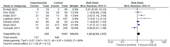 The VDLZ treatment group was compared with a CNTRL group in seven studies [34,35,37,43,44,45,47], including a total of 1527 patients (330 VDLZ group and 1197 CNTRL group). The overall effect showed a trend toward VDLZ (RR = 1.26, 95% CI: 0.94–1.67), but the difference was not statistically significant (p = 0.12) (Figure 3). Heterogeneity was moderate (I2 = 68%, p = 0.005), indicating some disagreement between the studies. More precisely, studies such as Kotze et al. [37] (RR = 2.02, 95% CI: 1.16–3.54) and Lightner 2019 [45] (RR = 3.19, 95% CI: 1.12–9.13) showed a statistical difference in favor of VDLZ, in contrast to studies such as Yamada et al. [43], which reported neutral or opposite results. Therefore, overall, the data do not allow for a safe conclusion regarding the clear superiority of VDLZ over the CNTRL group.
