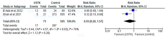 The meta-analysis of the two studies [44,47] showed no statistically significant differences between USTK administration and the Control group (RR = 0.55, 95% CI; 0.20–1.57, p = 0.26) (Figure 4). Despite the significant difference in Shah’s study [44], the high heterogeneity (I2 = 78%) and the non-statistically significant overall effect indicate the need for further research.