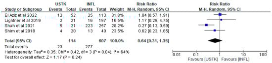 The effect of USTK in relation to INFL was compared in a meta-analysis of four studies [44,45,46,47], including in total 721 patients; 114 USTK and 607 INFL. Although there was a trend in favor of USTK (RR = 0.64, 95%CI: 0.31–1.35), the result was not statistically significant (p = 0.24). The heterogeneity between the studies was moderate (I2 = 64%, p = 0.04), indicating that differences between them may affect the validity of the overall conclusion. It is noteworthy that the study by Shah et al. [44] showed statistically significantly better results with USTK (RR = 0.27, 95% CI: 0.13–0.59), which may reflect differences in the population or intervention conditions. Therefore, further comparable studies are needed to assess the potential complications between the two groups (Figure 5).