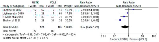 The meta-analysis of four studies [44,45,47,49] compared the effectiveness of perioperative administration of USTK versus VDLZ, in 309 patients (124 and 185, respectively). Overall, USTK was associated with a lower risk of postoperative adverse events (RR = 0.57, 95% CI: 0.26–1.27), but without a statistically significant difference (p = 0.17). The heterogeneity of the studies at I2 = 62% indicated differences in the results. It is worth nothing that the study of Shah et al. [44] showed statistically better results (USTK: RR = 0.25, 95% CI: 0.11–0.53), while El Aziz [47] showed no significant advantage (RR = 2.19, 95% CI: 0.54–8.91). These conflicting results thus demonstrate the need for further studies (Figure 6).