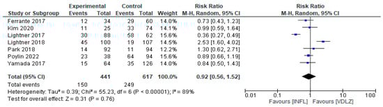 Seven studies were analyzed in order to compare the efficacy of INFL versus VDLZ [33,34,36,38,39,40,42,43]. The studies involved 1058 patients, 441 with INFL and 617 VDLZ. The overall result showed no statistically significant difference between the two treatments (RR = 0.92, 95%CI: 0.56–1.52, p = 0.76) (Figure 7). However, very high heterogeneity was observed, I2 = 89% (p < 0.00001), indicating significant differences between studies in terms of outcomes. Some studies [38,39] have demonstrated the superiority of VDLZ (RR = 2.53; 95% CI: 1.60–4.02), whereas others have reported greater efficacy with INFL (RR = 0.36; 95% CI: 0.27–0.49) [40]. This inconsistency reinforces the need for further research.