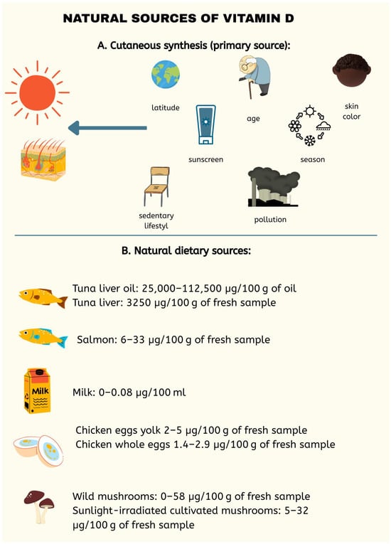 Vitamin D is divided into classes numbered 2–6, with the two primary forms being D2 and D3, which differ by a methyl group at C24 and a double bond between C22 and C23 in D2. The synthesis of this compound occurs predominantly in the epidermis from the substrate 7-dehydrocholesterol (7-DHC) with the participation of UVB radiation (290–315 nm) and heat. In the skin, UVB breaks the B ring, forming pre-vitamin D3, which is then rearranged into vitamin D3 by heat [10,11]. In this way, the D3 form (cholecalciferol) is produced, which can also be obtained from animal-derived foods, such as fish liver oils, fatty fish (including salmon, sardines, herring, and mackerel), and egg yolk (Figure 1). Processed foods fortified with vitamin D3 include dairy products, as well as orange juice and breakfast cereals. In contrast, vitamin D2 (ergocalciferol) is found in plant sources and even in fungi [10,12]. A summary is shown in Figure 1.