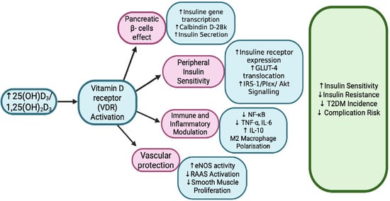 While traditionally recognized for its role in calcium and phosphate homeostasis, vitamin D has emerged as a potential modulator of glucose homeostasis, insulin action, and inflammatory responses [35]. The active form, 1,25(OH)2D, exerts its biological effects through binding to VDR, a nuclear transcription factor expressed in numerous tissues integral to glucose metabolism, including pancreatic islets, skeletal muscle, adipose tissue, and the liver [36]. This broad tissue distribution suggests that vitamin D may influence multiple pathogenic pathways in T2DM: ranging from β-cell preservation and insulin signaling enhancement to anti-inflammatory and vasculoprotective effects [13]. Since VDR mediates vitamin D’s effects, we looked at the Fok1 (rs2228570) variant, which produces a slightly shorter receptor protein. Nevertheless, analyses including gene expression studies and a meta-analysis found no clear association between this variant and T2DM [37]. At the pancreatic level, vitamin D facilitates insulin biosynthesis and secretion by modulating intracellular calcium flux, which is essential for insulin granule exocytosis [38]. It regulates the expression of genes encoding insulin and insulinotropic enzymes, such as calbindin, thereby enhancing β-cell responsiveness to glucose. In insulin-sensitive tissues, VDR activation increases the transcription of insulin receptor genes and insulin receptor substrate proteins (IRS-1 and IRS-2), promoting effective downstream signaling via the PI3K and Akt pathways [39]. Vitamin D also upregulates Glucose Transporter Type 4 (GLUT4) expression in skeletal muscle and adipocytes, enhancing peripheral glucose uptake [40]. Moreover, vitamin D exerts potent anti-inflammatory actions by inhibiting nuclear factor kappa B (NF-κB) activation, downregulating pro-inflammatory cytokines (TNF-α, IL-1β, IL-6), and suppressing chemokine production, which collectively reduce macrophage recruitment and adipose tissue inflammation [41]. It shifts the immune balance toward a more tolerogenic state by promoting the differentiation of regulatory T cells and reducing Th1/Th17 pro-inflammatory responses [29]. A study conducted by Arfian N. et al. in diabetic mice demonstrated that vitamin D (calcitriol) treatment reduced lung inflammation. Diabetic mice showed increased inflammatory markers, including NF-κB, IL-6, monocyte chemoattractant protein-1 (MCP-1), and macrophage infiltration (CD68), but these were significantly lower in vitamin-D-treated groups. These findings suggest that vitamin D can attenuate inflammatory responses, likely through its immunomodulatory and anti-oxidative effects, offering protective benefits against diabetes-related lung injury [42]. Moreover, vitamin D plays a role in regulating immune system activity, particularly by enhancing antimicrobial defenses such as cathelicidin production in monocytes and Paneth cells, which helps protect against infections and reduce intestinal inflammation. Its signaling through VDR and activation of Toll-like receptors promotes macrophage antimicrobial effects, while mTOR-mediated pathways aid in reducing airway inflammation via increased autophagy. Although some studies suggest vitamin D supplementation may lower the risk of respiratory infections, results remain inconsistent, highlighting the need for larger, well-designed trials [43]. In adipose tissue, vitamin D inhibits preadipocyte differentiation, modulates adipokine secretion toward a more insulin-sensitizing profile (increasing adiponectin, reducing resistin), and attenuates oxidative stress through upregulation of antioxidant enzymes [44,45]. The schematic in Figure 2 illustrates the main mechanisms by which vitamin D influences the risk of developing type 2 diabetes.