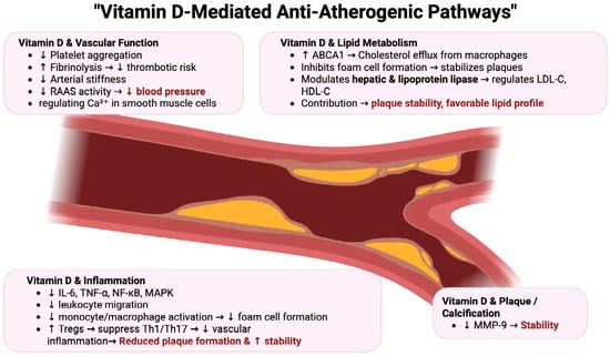 Vitamin-D-Mediated Anti-Atherogenic Pathways in Cardiovascular Protection [29,123,124,125,126,127]. Vitamin D exerts multifaceted protective effects against atherosclerosis by modulating inflammation, endothelial function, lipid metabolism, plaque stability, and thrombosis. These coordinated actions reduce vascular inflammation, improve endothelial health, promote favorable lipid profiles, stabilize plaques, and lower thrombotic risk, ultimately decreasing the progression of atherosclerosis and reducing cardiovascular events. Abbreviations: ABCA1—ATP-binding cassette transporter A1, Ca2+—calcium ion, HDL-C—high-density lipoprotein cholesterol, IL-6—interleukin 6, LDL-C—low-density lipoprotein cholesterol, MAPK—mitogen-activated protein kinase, MMP-9—matrix metalloproteinase 9, NF-κB—nuclear factor kappa-light-chain-enhancer of activated B cells, RAAS—renin-angiotensin-aldosterone system, Tregs—regulatory T cells, TNF-α—tumor necrosis factor alpha, Th1/Th17—T helper 1 and T helper 17 cells.