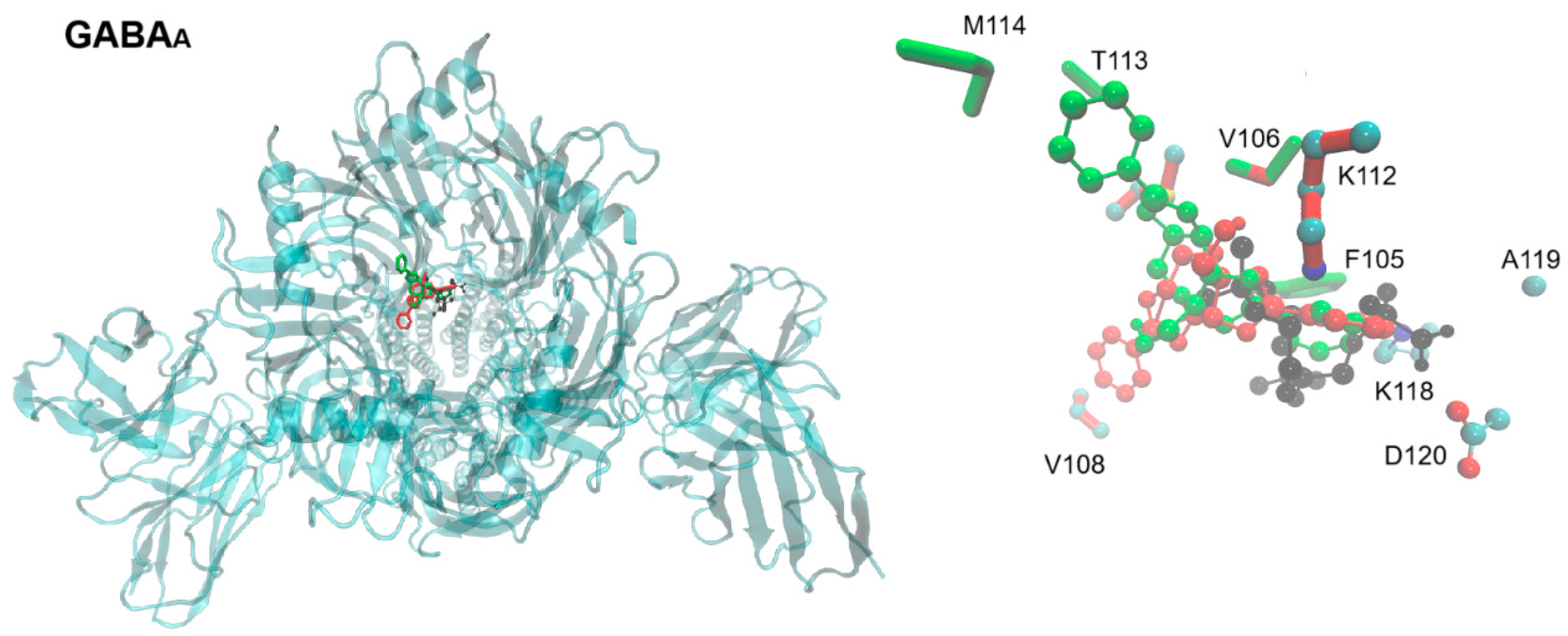 - Kim, J.J.; Gharpure, A.; Teng, J.; Zhuang, Y.; Howard, R.J.; Zhu, S.; Noviello, C.M.; Walsh, R.M., Jr.; Lindahl, E.; Hibbs, R.E. Shared structural mechanisms of general anaesthetics and benzodiazepines. Nature 2020, 585, 303–308. [Google Scholar] [CrossRef]