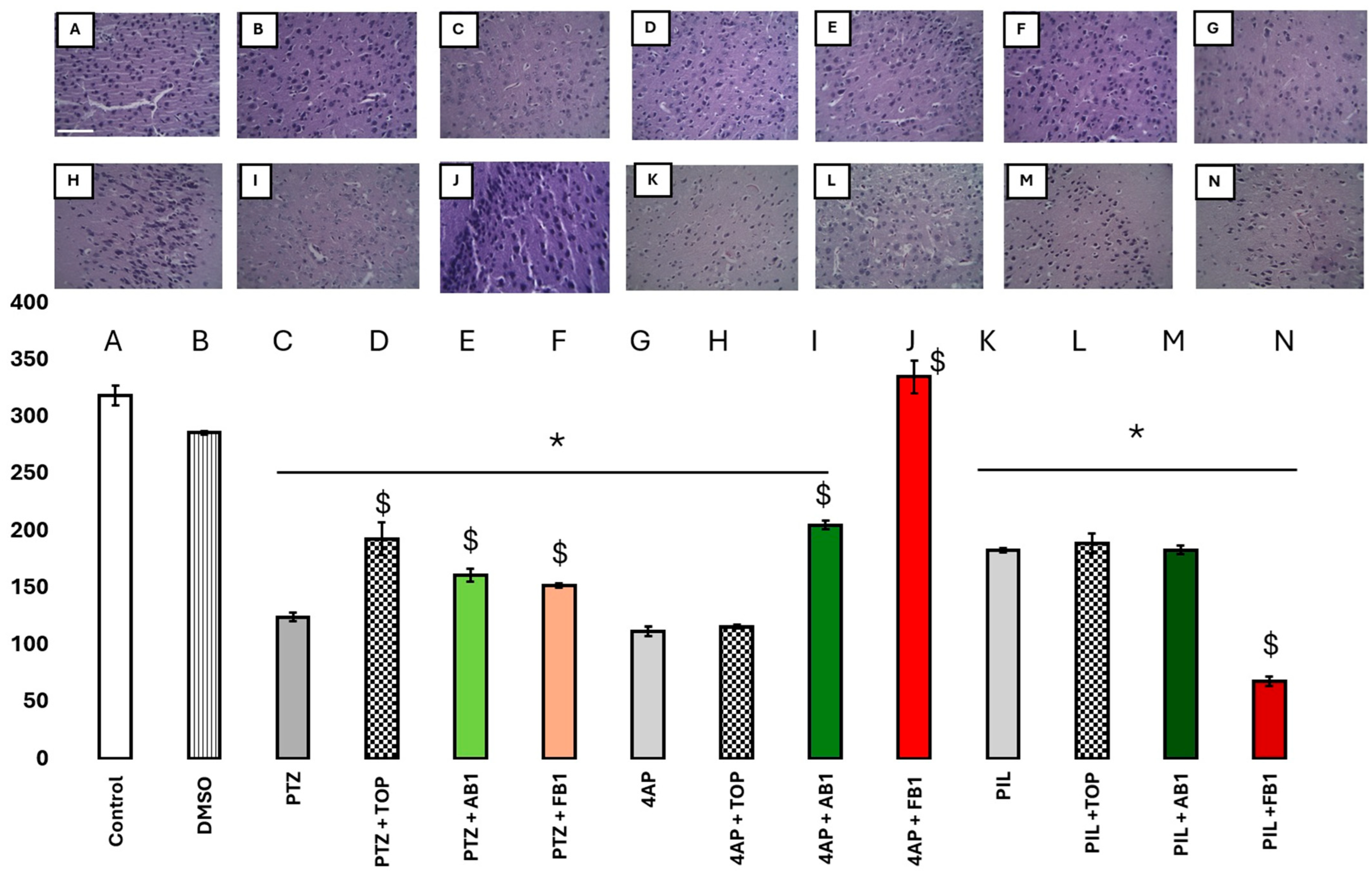 - Balaha, M.F.; Alamer, A.A.; Abdel-Kader, M.S.; Alharthy, K.M. Ameliorative potential of (-) pseudosemiglabrin in mice with pilocarpine-induced epilepsy: Antioxidant, anti-inflammatory, anti-apoptotic, and neurotransmission modulation. Int. J. Mol. Sci. 2023, 24, 10773. [Google Scholar] [CrossRef] [PubMed]