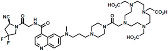 The first radiolabeled FAP inhibitor (FAPI) developed was [125I]I-MIP-1232, a boronic-acid-containing compound evaluated in vitro [14]. However, this early agent showed suboptimal specificity and affinity for FAP when compared to other members of the DPP and prolyl oligopeptidase (PREP) families [14,15]. Subsequently, a new class of FAPI molecules was synthesized based on the N-(4-quinolinoyl)-Gly-(2-cyanopyrrolidine) scaffold, exhibiting significantly improved pharmacokinetics and FAP-targeting characteristics in preclinical and clinical studies [16,17].